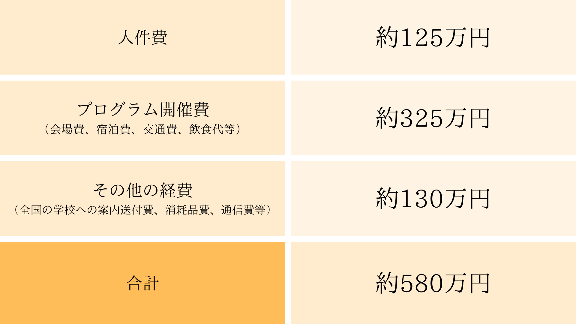全国から集う70名ほどの参加者に対し、交通費等も含めたプログラム参加に係る費用はすべて当財団で負担しているため、毎年平均600万円程度の経費がかかっています。
