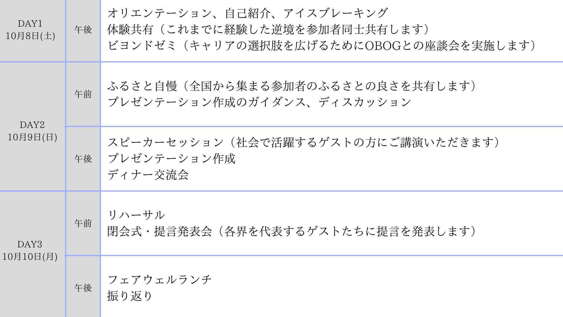 日数としては3日間という短いプログラムにはなりますが、過去には多くの学生が「人生が変わる3日間だった」という感想を持ってプログラムを結了しており、参加学生にとっては非日常で刺激的な場を提供することができています。