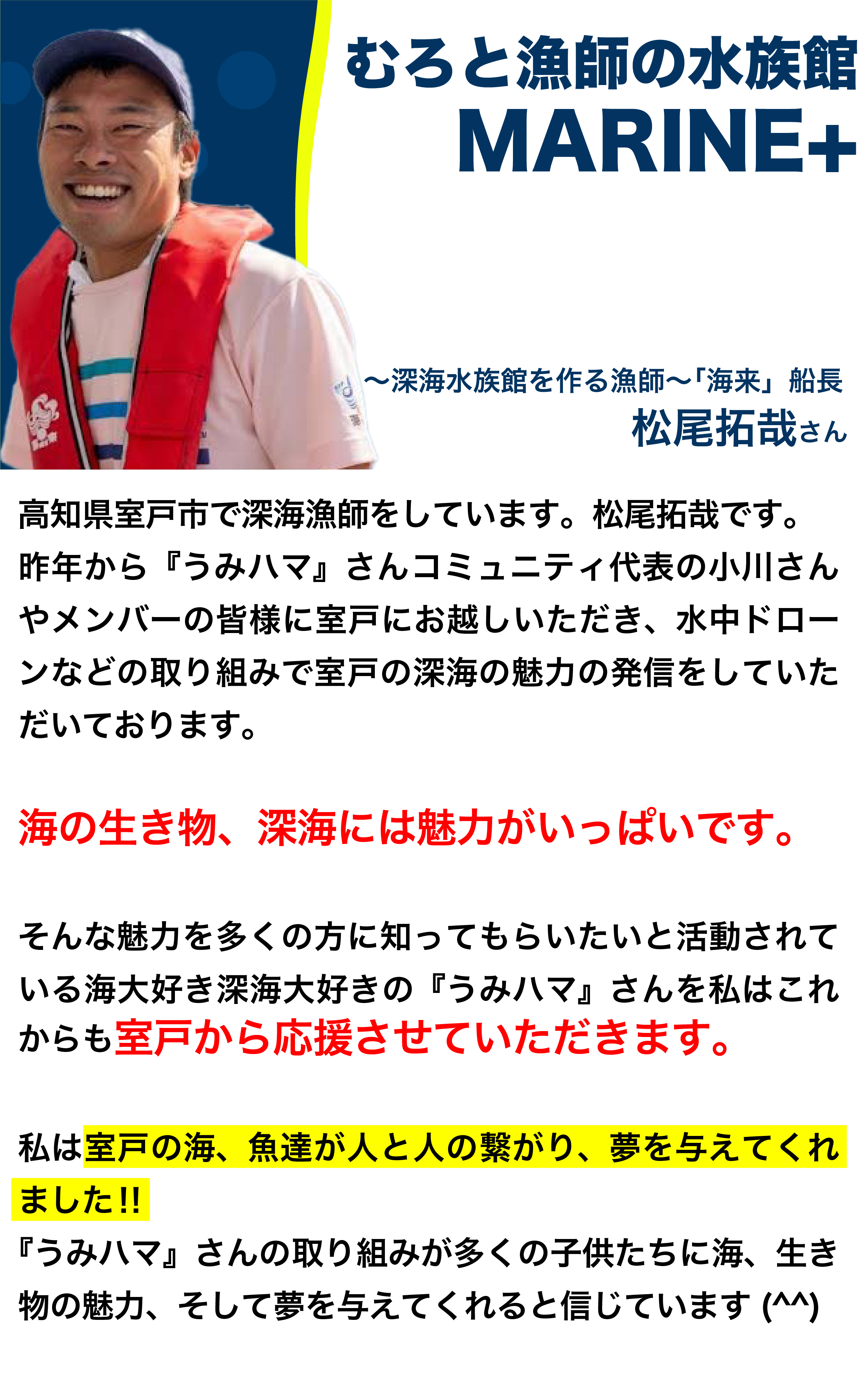 「うみハマ」が、老若男女を問わずに深海生物を愛する人たちの共有の場所になればと願っています。