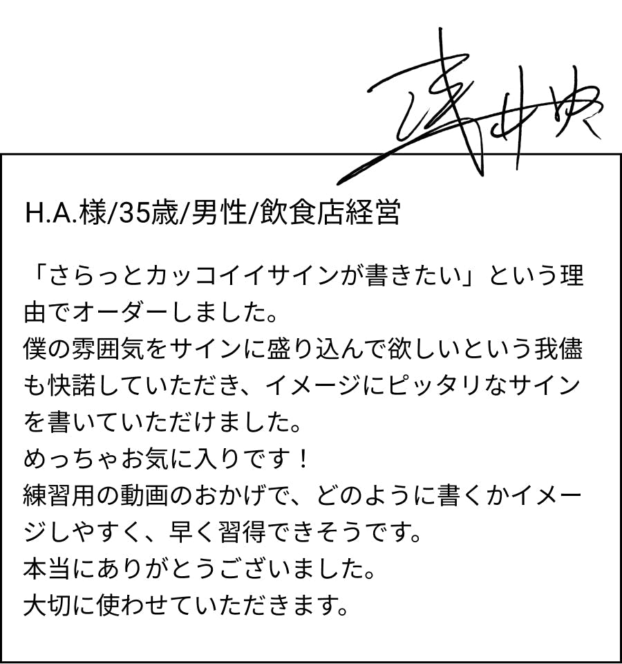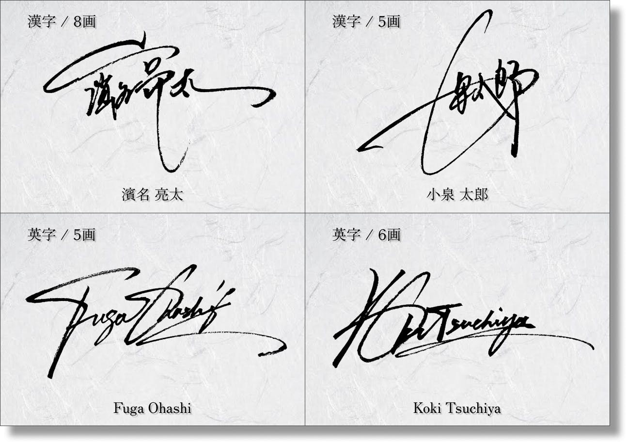 プロの書道家がデザインしたオリジナルサインは、デザイン性が高いことはもちろん、バランスが取りやすく、5~10分と少し練習するだけで書けるようになるため、「いつかカッコいい字が書けるようになりたい」という欲求をすぐに叶えることができます。