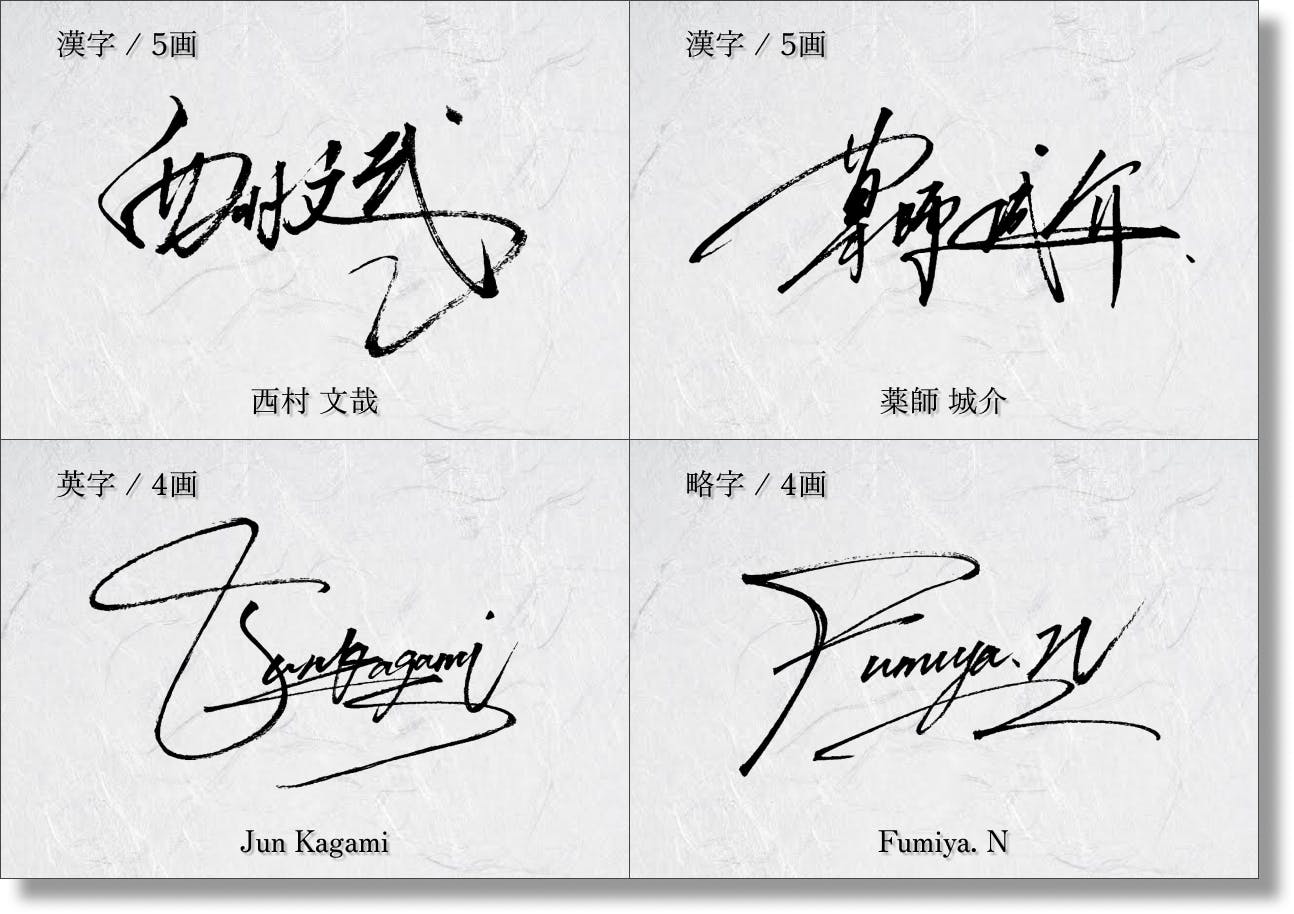 今回はそれらの成果を基に、5つの書体でサインを創作させていただきます。