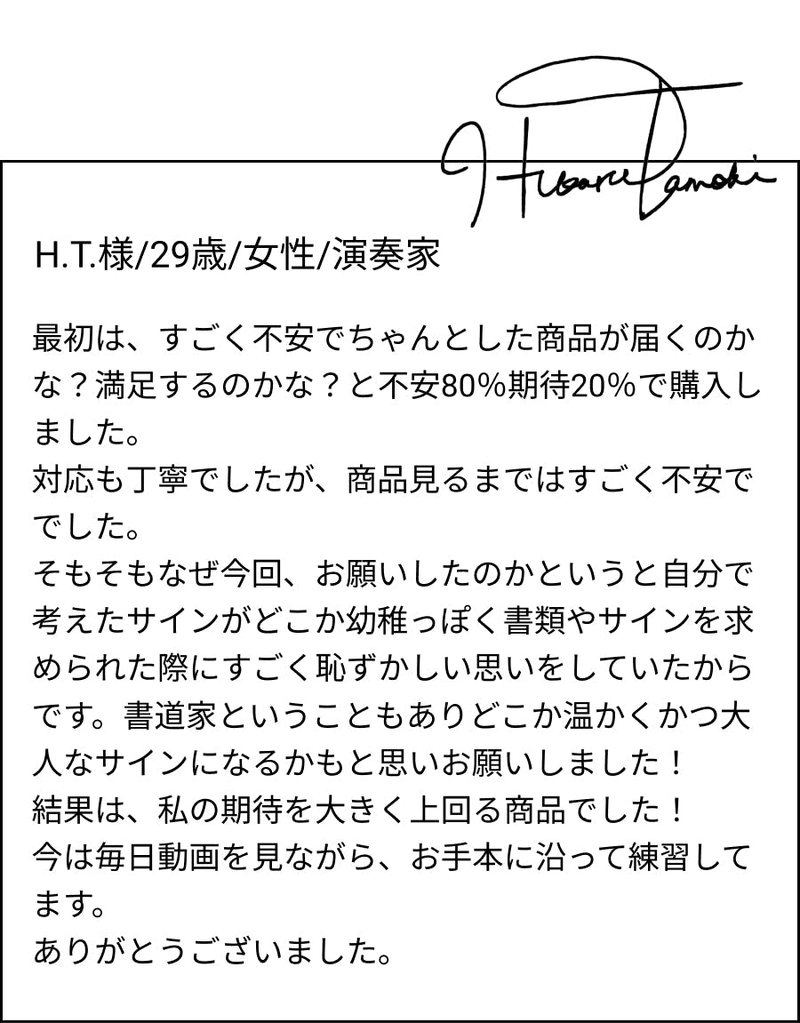 追加料金¥10,000 をお支払いいただくことで、ご納品させていただくオリジナルサインを「筆文字Ver.」に変更できます。 こちらは「とめ・はね・はらい」などが通常のサインよりも強調されるため、書道家の本領が発揮されるオプションとなります。 通常のプランでご納品させていただくボールペンで書いたサインとは一線を画す深みのある仕上がりが特徴です。