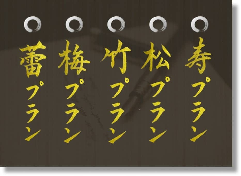 松プラン、金の松プラン、オーダー作品がセットとなる、今回だけの特別プランです。オーダー作品はお名前or好きな言葉(4文字まで)を色紙に書いて額に入れた状態で郵送納品にてお届け致します。お祝いごとの記念品としてもオススメです。心に残る特別な思い出を作りたい場合にご活用ください。