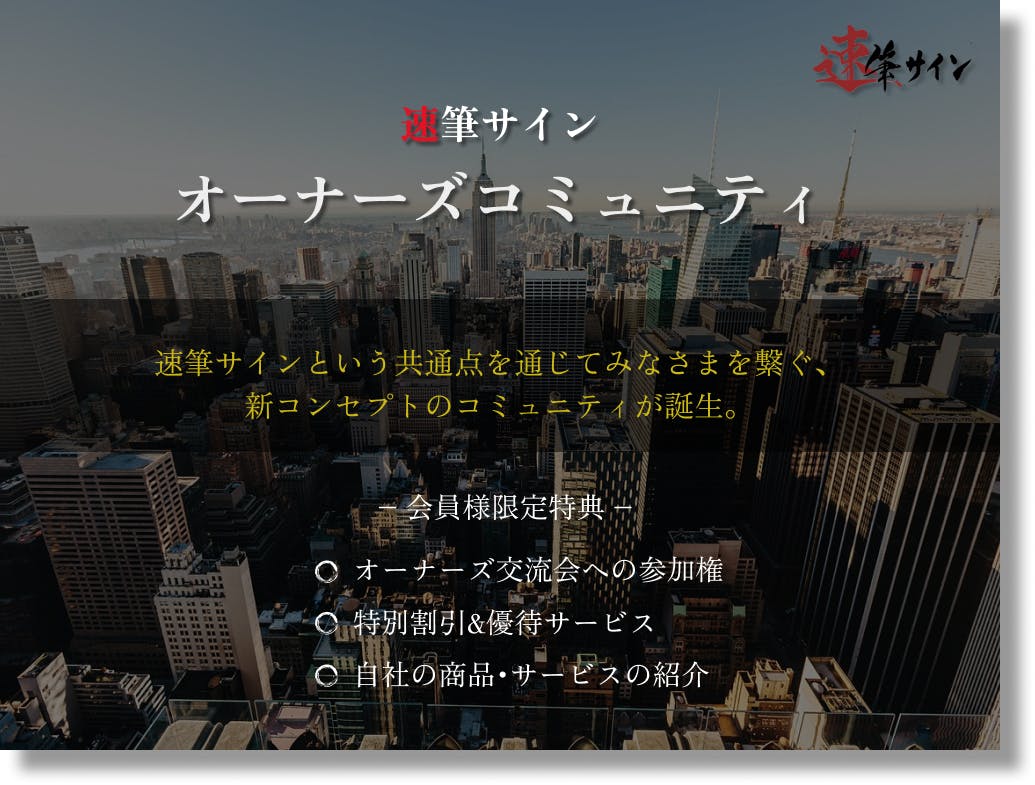 速筆サインオーナーズコミュニティとは、速筆サインオーナーズ会員様同士を繋ぎ、ビジネス・プライベートの機会を拡大する新コンセプトのサービスです。(※【竹プラン】以上のプランをご注文いただいた方限定のサービスとなっております。)