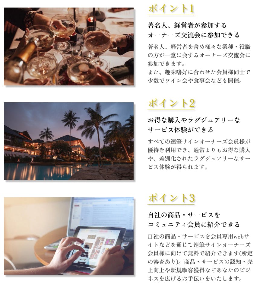 また、速筆サインオーナーズコミュニティを通じて提供される多種多様な優待サービスをご利用いただけます。