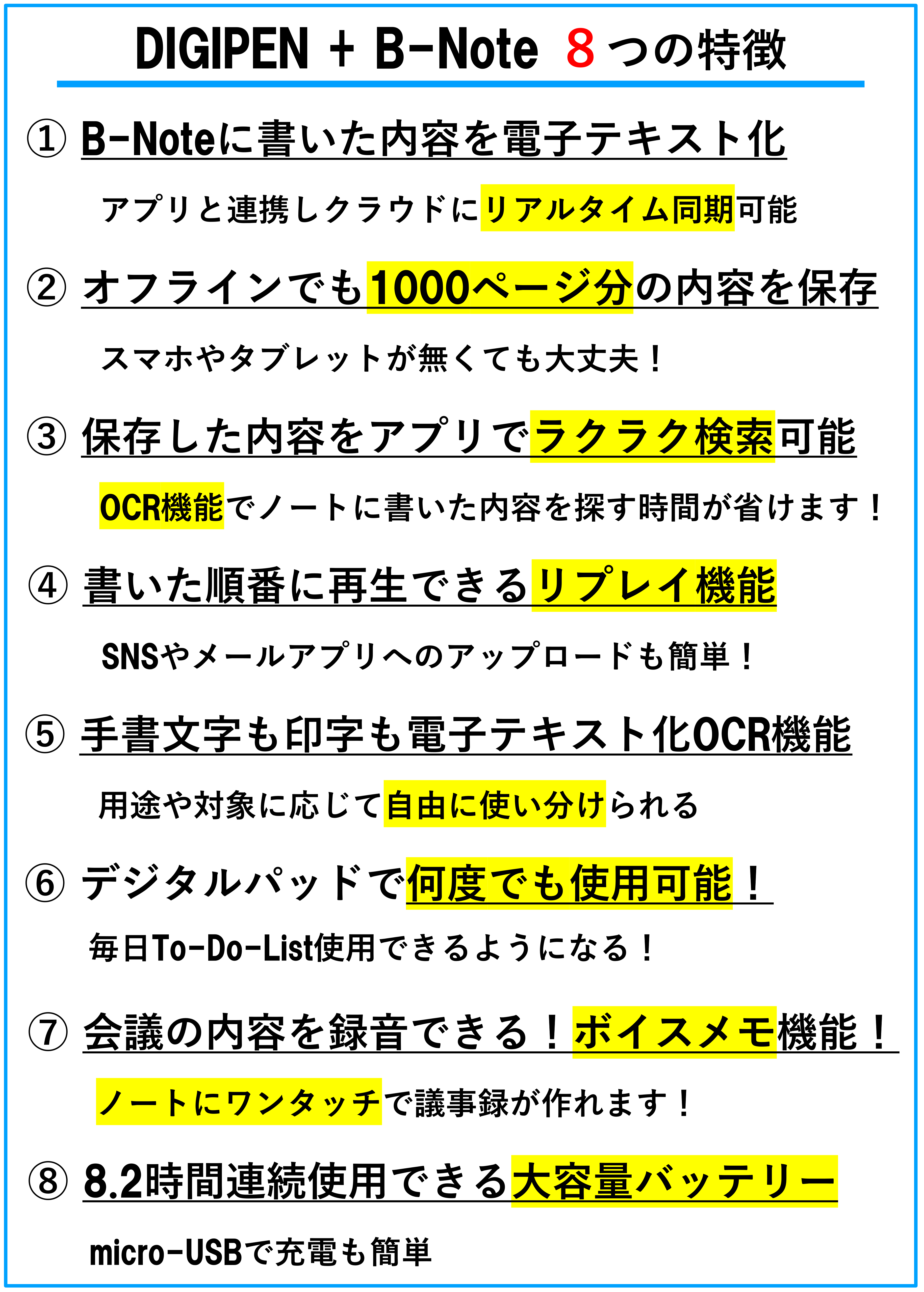 A5サイズの専用開発"B-Note"または10インチのDIGIPADにDIGIPENで書いた内容を、専用アプリとBluetooth連携するだけで簡単に電子テキスト化出来ます!