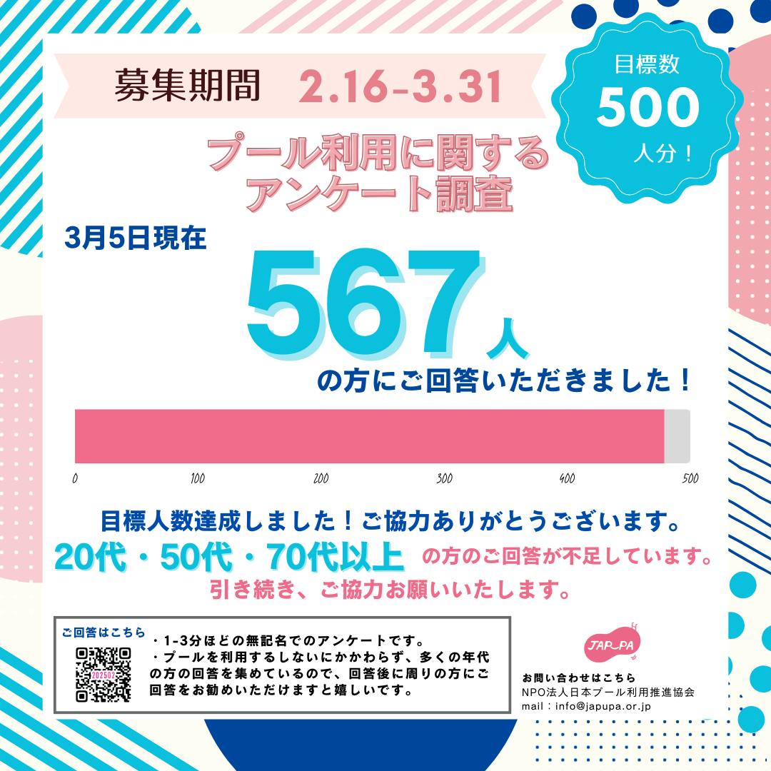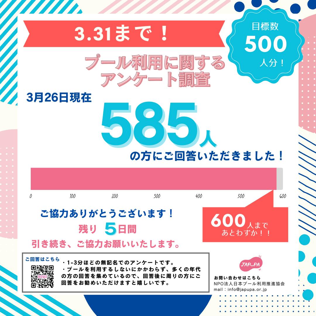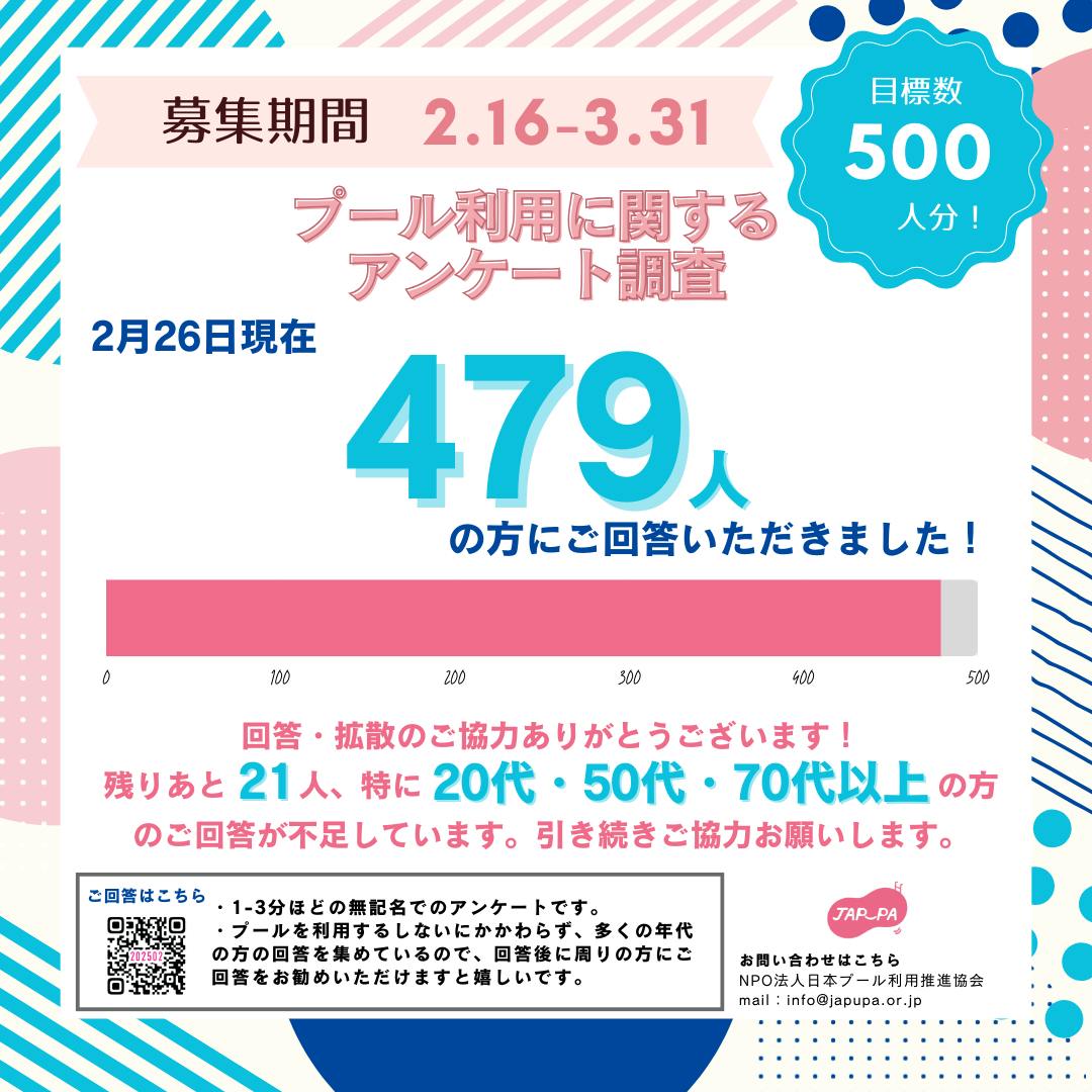 2025/03/26 12:002月16日から開始した「プール利用に関する意識調査」、目標の500件を達成し、もうすぐ600件に到達です!https://japupa.or.jp/?p=806ご回答いただいた方、シェアしてくださった方、ありがとうございます。3月31日の締切まで、まだまだ回答募集中です。私たちが一番聞きたい「プールに行かない人」の声を、幅広い年代の方から聞けたらと思います。〔回答方法〕下記のフォームにアクセスしての回答https://questant.jp/q/K7H7VNRZ所要時間:1-3分対象:問いませんご自身のご回答後に、SNSやお知り合いの方へのシェアなどもお願いできたら嬉しいです!よろしくお願い致します。 もっと見る