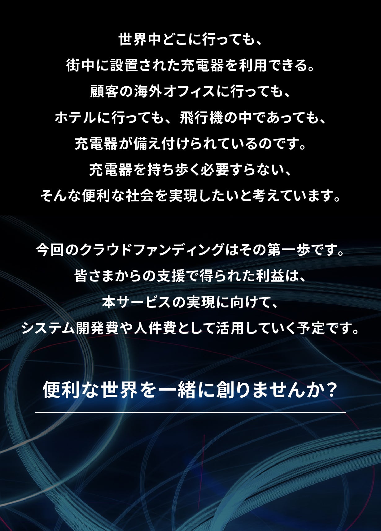 2022/11/01 09:00昨日、10/31 23:59をもちましてクラウドファンディングを終了致しました。ご支援くださった皆さま、応援して下さった皆さま、ありがとうございました。今回のクラウドファンディングは残念ながら目標金額を達成することができませんでした。All or Nothing形式で実施しておりましたため、ご支援につきましては全額払い戻しとなり、リターンの発送も行わない予定となっております。Campfireより別途連絡があるかと思いますので、メール等ご確認頂けますと幸いです。不明瞭な点がございましたら、こちら宛にご連絡頂ければ代わって Campfireに確認させて頂きますので、ご気軽にご相談ください。クラウドファンディング未達となってしまったため、現時点でチャーブル発注の目処は立っておりません。しかしながら、本クラウドファンディングを通して様々な方からご連絡を頂くことが出来まして、引き続き充電に悩まない世界を実現するべく事業検討を進めていこうと考えている次第でございます。またどこかで本サービスを目にするようなことがございましたら、今回のクラウドファンディングを思い出して頂けますとうれしい限りでございます。この度は本当にありがとうございました。 もっと見る