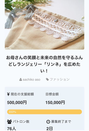 2018/05/11 06:38クラウドファンディング終了いたしました! ありがとうございました。 「なんとかいけるだろう」という自信と 「ぜんぜんうまくいかないんじゃないか」という不安と ごちゃまぜに始まった2か月前 総額503000円、支援者77名、達成率335% 数字よりなにより、応援してくれる人たちがいるということがはっきりと自覚できたことは、わたしにとって、何より代えがたい経験になったと思います。 しかも、楽しかったんです。とっても^^ 支援いただいた皆様、応援いただいた皆様、プロジェクトを見守ってくださった皆様 笑顔の中で終了できたこと!心より感謝申し上げます。 本当にありがとうございました! このご縁をさらに良いものにしていくよう活動していきます。 今後ともどうぞよろしくお願いいたします! ご支援いただいた皆様へ リターンについては随時ご連絡をさせていただきます。 今しばらくお待ちください。 支援者全員プレゼントのエシカル講座! 5/19開催いたします。 本日中にご連絡をさしあげますので、ご支援いただいた皆様はメールをぜひご確認の上、ご返信お願いいたします。 宜しくお願いいたします! もっと見る