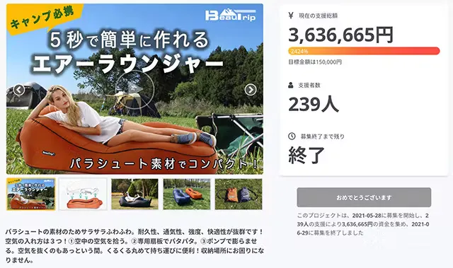 2022/07/18 08:40応援くださっている皆様おはようございます!BEAUTRIP Japan by ARTRIPです。この度はプロジェクトを無事に公開し、1日以内に目標金額を達成することができました。応援を頂きまして、誠に感謝申し上げます!アウトドア、インドア共にとてもリラックスできる製品で、誰でもすぐに簡単に膨らましたりコンパクトにするができ、とても便利な仕様となっております。いろんなシーンでご利用することができ、防災用にもとても役に立つと思います。引き続きより良い製品をお届けできる様、精進して参りますのでどうぞ宜しくお願いいたしま^_^ もっと見る