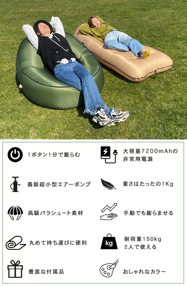 ボタン1つで自動で1分で膨らますことができる、高品質パラシュート素材で超小型エアーポンプ内蔵、新エアーラウンジャー・エアーソファの新登場です。