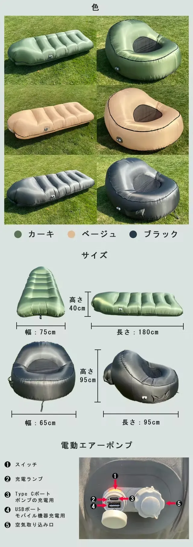 ・プロジェクトの属性:輸入商品 ・本商品の一押しポイント:電動エアーポンプ内蔵、パラシュート素材、屋内外用ポータブルなエアーベッド