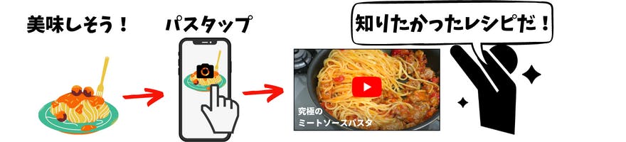 美味しそうだと思った”パスタ”を見つけたら、すぐに”タップ(撮影して送信) ”するだけで、一番見た目の似ているパスタのレシピ動画が分かる 。