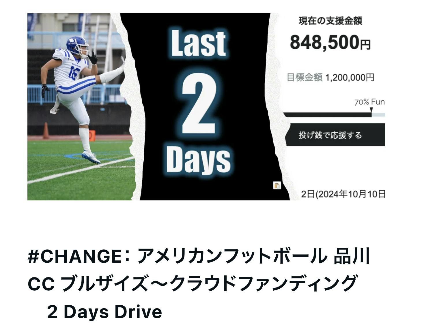 2024/10/08 18:129月4日に開始したクラウドファンディングも残すところ後2日となりました。これからは2Minitues Drive ならぬ、2 Days Drive ですGMの岸原のnote にて クラファンに取り組む心境を、あらためて発信しています。===マイナースポーツであるアメリカンフットボールの中堅チームとして、私たちができることは「やれることは全部やる」しかありません。クラウドファンディングもその一環です。前節、米国人選手QB-WRを擁する電通キャタピラーズに大敗しました。かつては勝てた相手との実力差が浮き彫りとなり、「お金がすべてではないが、お金がなければ勝てない」という現実を痛感しました。だからこそ、このクラウドファンディングも達成させたいと考えています。残り数日間、引き続きご支援とご協力をよろしくお願いします。 ===ぜひご一読ください。 クラファンはこちらです。ご支援の程、よろしくお願い致します もっと見る