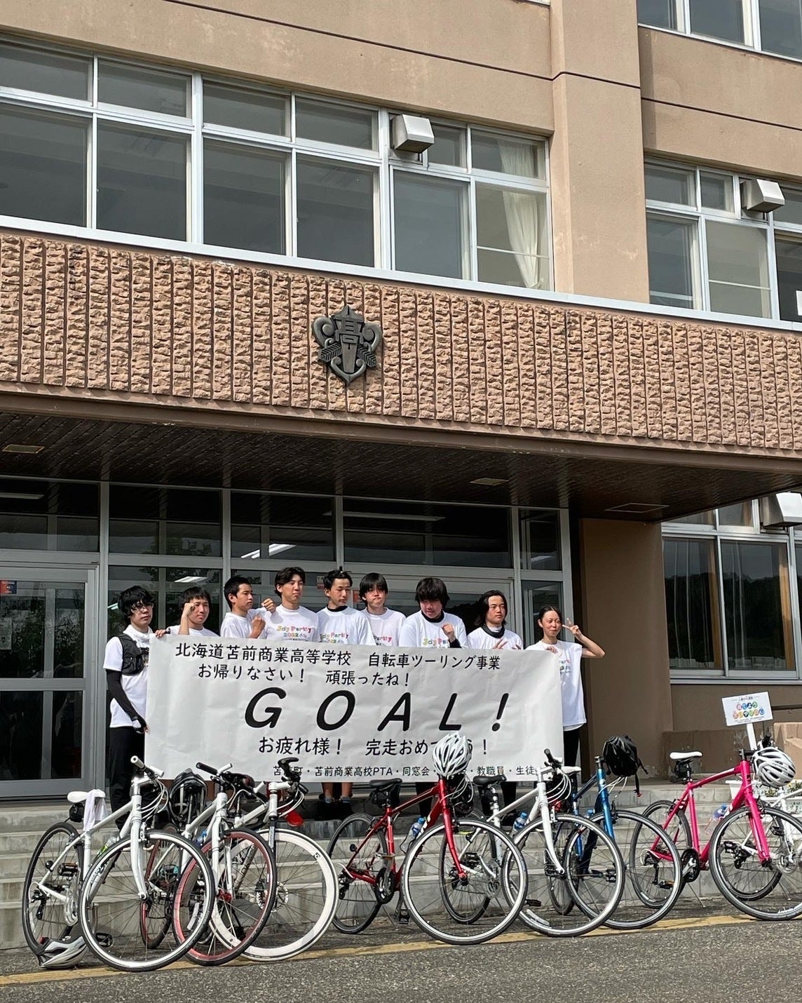 2022/08/01 14:237月28日(木)ツーリング3日目〈最終日〉 7:00起床で7:30から朝食をたべました 朝食はお味噌汁やいろいろな種類のおかずをいただきました ホタテの稚貝が入ったお味噌汁がとても美味しかったです 出発前にチームの結束を高めるためにゲームをし心と体をあたためました ゲームの様子 8:30頃NHKの取材も入りちょっとドキドキしながらお揃いのTシャツを着て旭温泉を出発しました 1日目に経験したアップダウンの多い道を逆方向から通りました 相変わらずアップダウンが激しくてつらい思いをしましたが自分で自分を励ましたりメンバー同士声をかけながら乗り越えました スタート直後 1日目に寄れなかったしょさんべつ天文台で絶景の日本海をバックにみんなのテンションもアップ いつか星に名前を付けに訪れたいです そしてオロロン鳥モニュメントをめがけてまた走り出しました オロロン鳥モニュメントでは自転車で一人旅をしている13歳の男の子と出会いエールを送りつつ自分たちも頑張ろうという気持ちに火が付きましたしょさんべつ天文台で写真撮影オロロン鳥での記念撮影 昼ご飯ははぼろバラ園でそうめんとお弁当を食べました 昼寝をしたり海鳥センターを覗いたりなどゆっくり過ごしラストスパートに向けて体を休めましたバラ園での昼食 苫前町役場では役場の皆様に出てきてくださりスポーツ飲料の差し入れもいただきました 苫前町長から「ここから先登りはないから楽しんで」とお声掛けをいただきましたとままえだベアーの前で記念撮影 学校には14:30に到着し、沢山の保護者の方や町民の皆様そして先生にお出迎えいただきました 自分たちが走ってみて感じたことや成長したことを一人ずつ話をしサポートをしてくれている方々に感謝を伝え記念撮影をしました到着式の様子 クラウドファンディングや差し入れ、サポーターとしてなど援助してくださった沢山の支援者の皆様、この度は本当にありがとうございました 私たち苫前商業高校の活動は沢山の方々の支えがあって成り立っています 支援をいただけることが当たり前だととらえずに感謝をもって日々活動していきます 9月完成を目指してYouTubeへアップする動画の作成や支援していただいた方々へのお礼などに取り掛かります 今後ともよろしくお願いします もっと見る