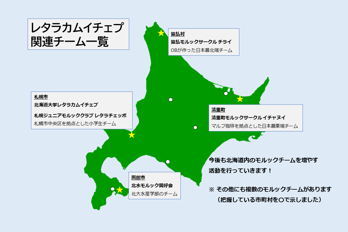 また、地方チームとして、道北には「猿払村モルックサークル チライ」、道東には「清里町モルックサークル イチャヌイ」を設立しました。道南では北海道大学函館キャンパス(水産学部)の「北水モルック同好会」が、レタラカムイチェプ結成前から活動しています。