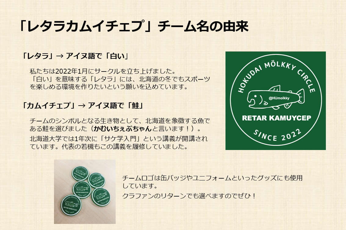アイヌ語で「白い」を意味する「レタラ」には、冬の北海道でも多くの人がスポーツを楽しめる環境を作りたいという願いを込めています。同じくアイヌで「鮭」を意味する「カムイチェプ」は、北海道を象徴する魚です。ロゴの中央に描かれた公式キャラクターの「かむいちぇぷちゃん」は、北海道大学構内を流れるサクシュコトニ川の鮭で、多くのグッズにも登場しています。