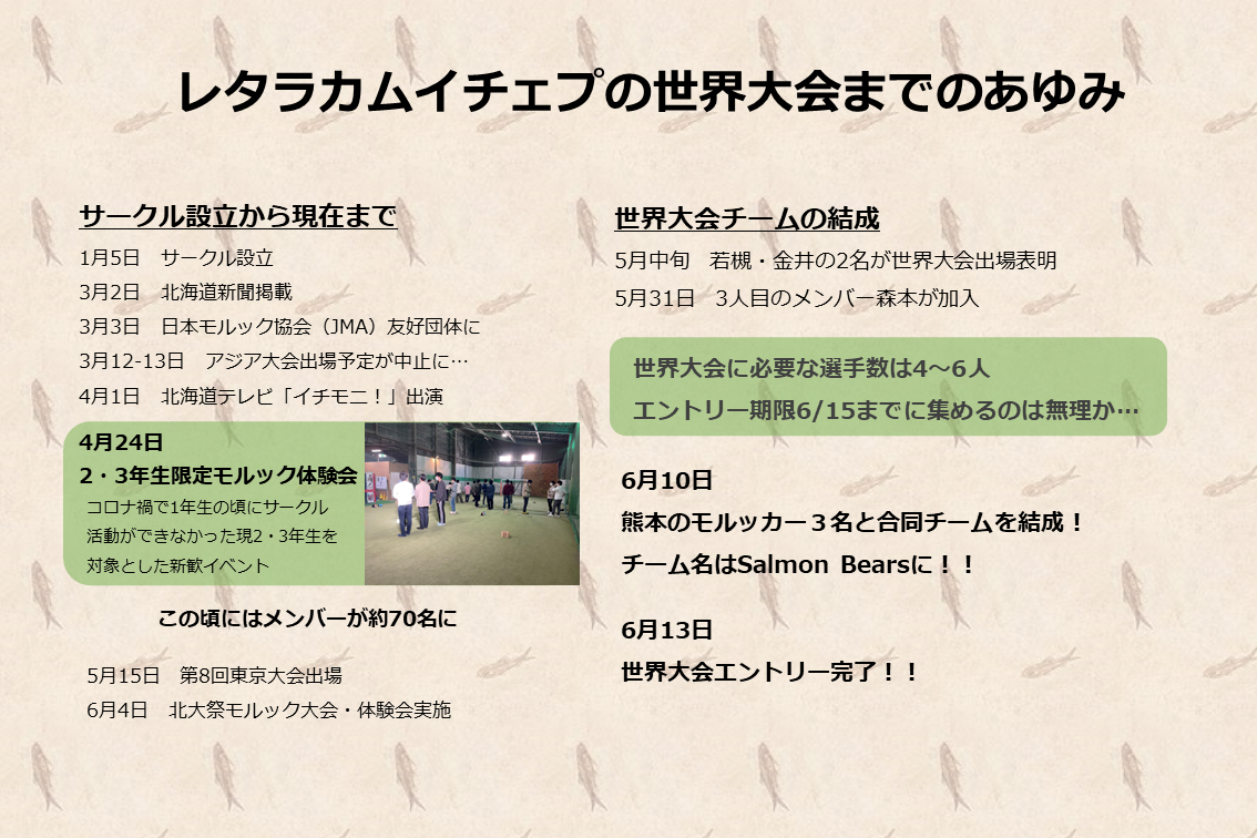 世界大会には熊本県のモルッカー3名と合同の6人チームで出場します。なかなかフランスに渡れる人が見つからず、締切直前になってようやくチームを作ることができました。