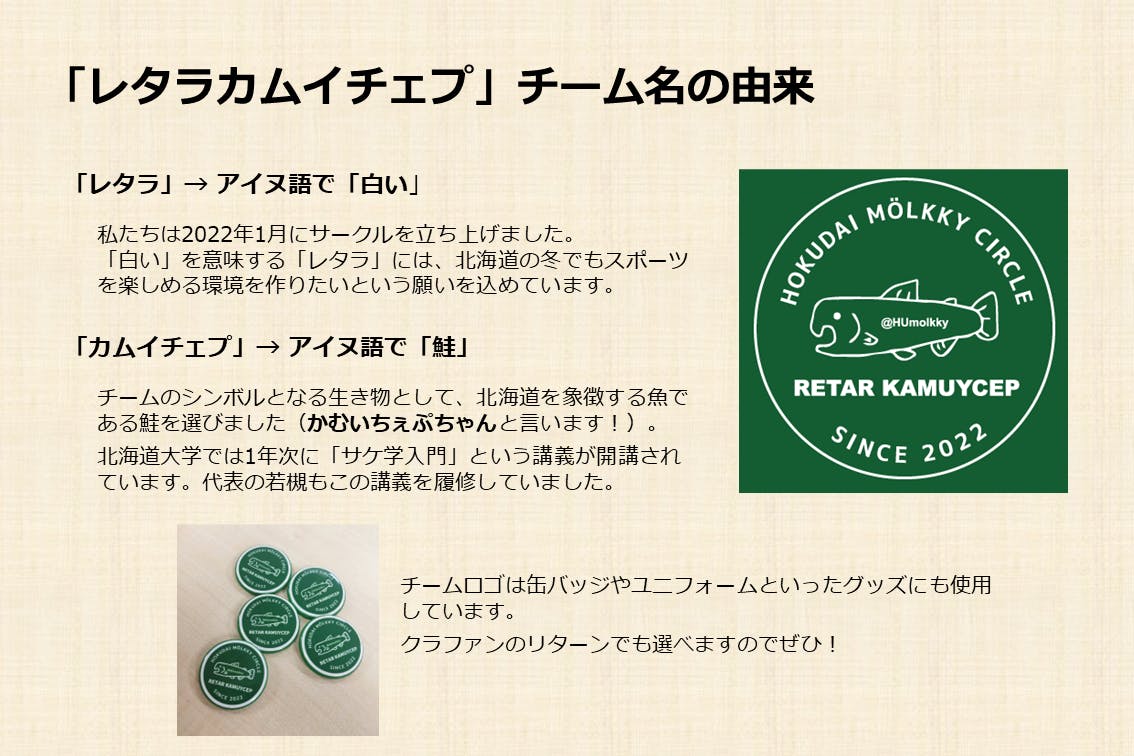 2023/07/05 18:35昨年度の世界大会クラウドファンディングでは大変お世話になりました。北海道大学モルックサークルレタラカムイチェプの若槻です。今年の世界大会には参加できないのですが、来年の函館開催に向けて活動を続けております。昨日7/4に今年度のユニフォームスポンサー募集等のためのクラウドファンディングを開始しました。この春、北星学園大学のメンバーが独立してサークルを立ち上げ、合同でのプロジェクトとなります。 北海道大学・北星学園大学モルックサークルの2023年度の活動にご協力ください!去年の世界大会のような大きな名目はなく、小さな規模のものですが。世界大会のあとどうなったの?という方もいらっしゃると思いますので(Twitterが誤凍結されてしまいましたし…)、ぜひプロジェクトページを読んでいただけると嬉しいです。最近だと北海道中札内村のイベントで、さらば青春の光の森田さん率いるあのキングオブモルックと対戦しました(こちら)近日中に水曜どうでしょうの藤村D率いるTEAM HTBとの練習試合も実施予定です(告知動画)もちろん、練習会や普及活動も変わらず実施しています。noteでは引き続き毎月の活動報告をあげていますので、よかったらぜひ読んでください。来年の世界大会函館開催に向けてモルックへの注目が集まっています。プレーしている方もそうでない方も、モルックがどこに向かっていくのか、楽しみながら見守っていただけたらと思います。 もっと見るリターン発送完了しました