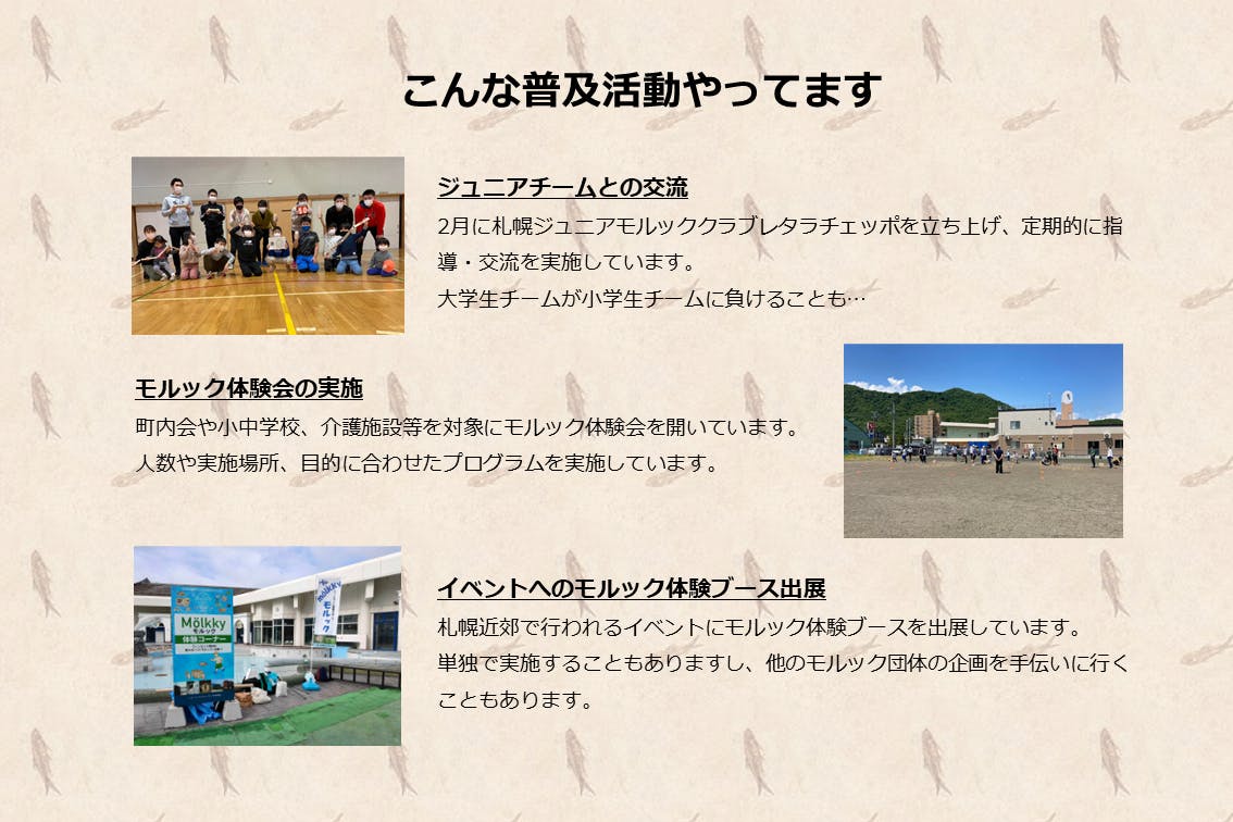 まず、ジュニアチームとして「札幌ジュニアモルッククラブ レタラチェッポ」(JMA友好団体)を設立しました。小学生への指導・普及を行っています。