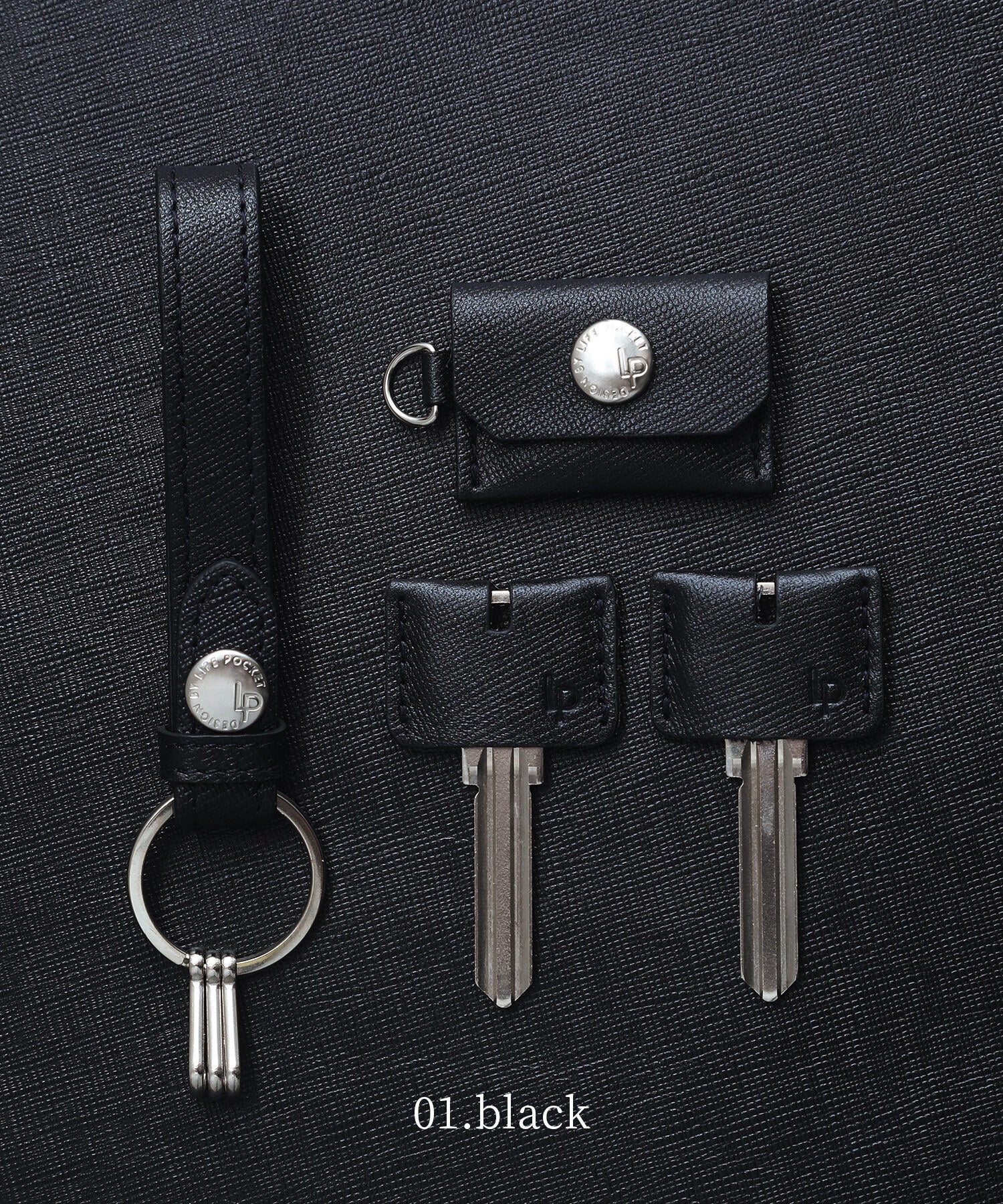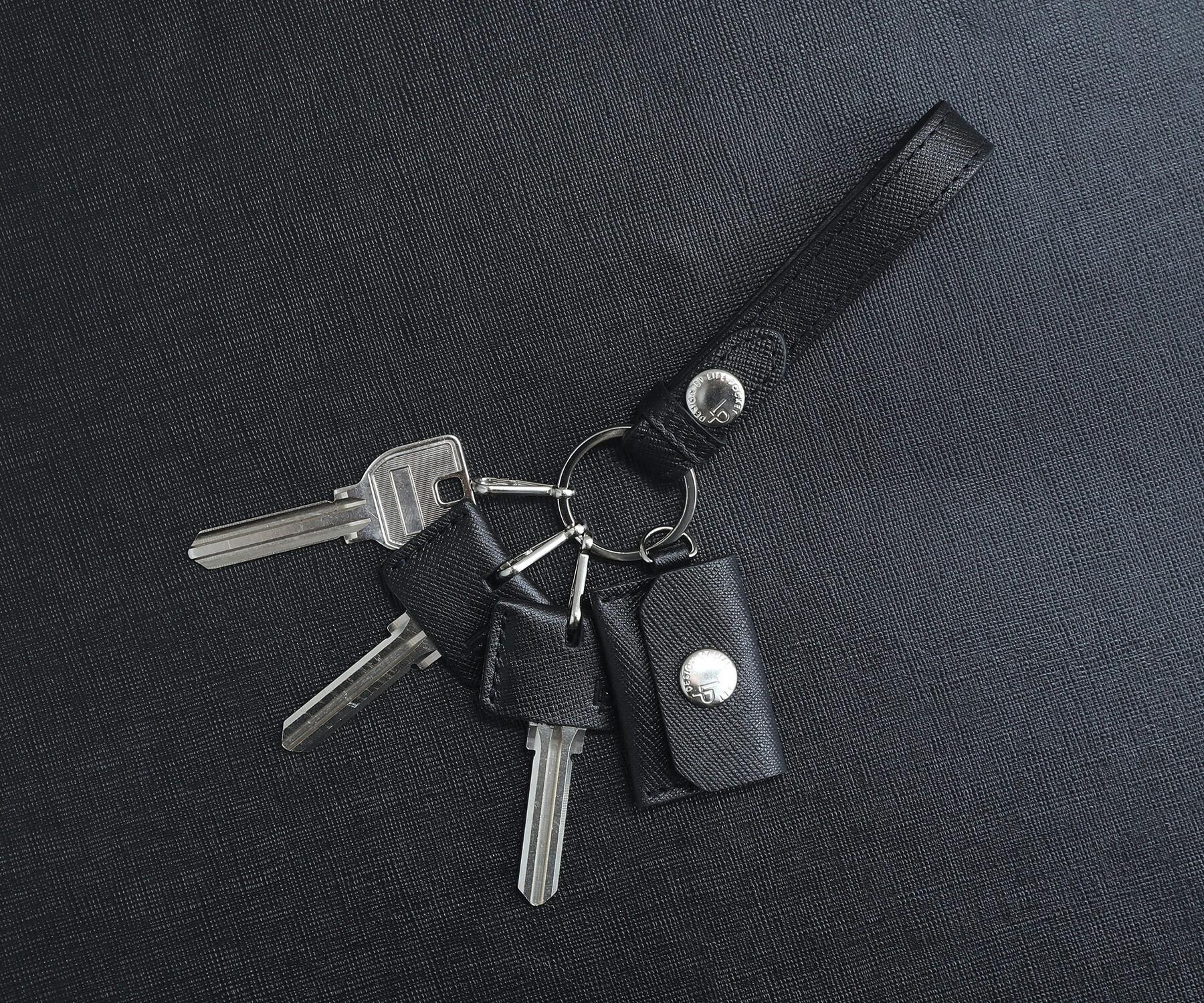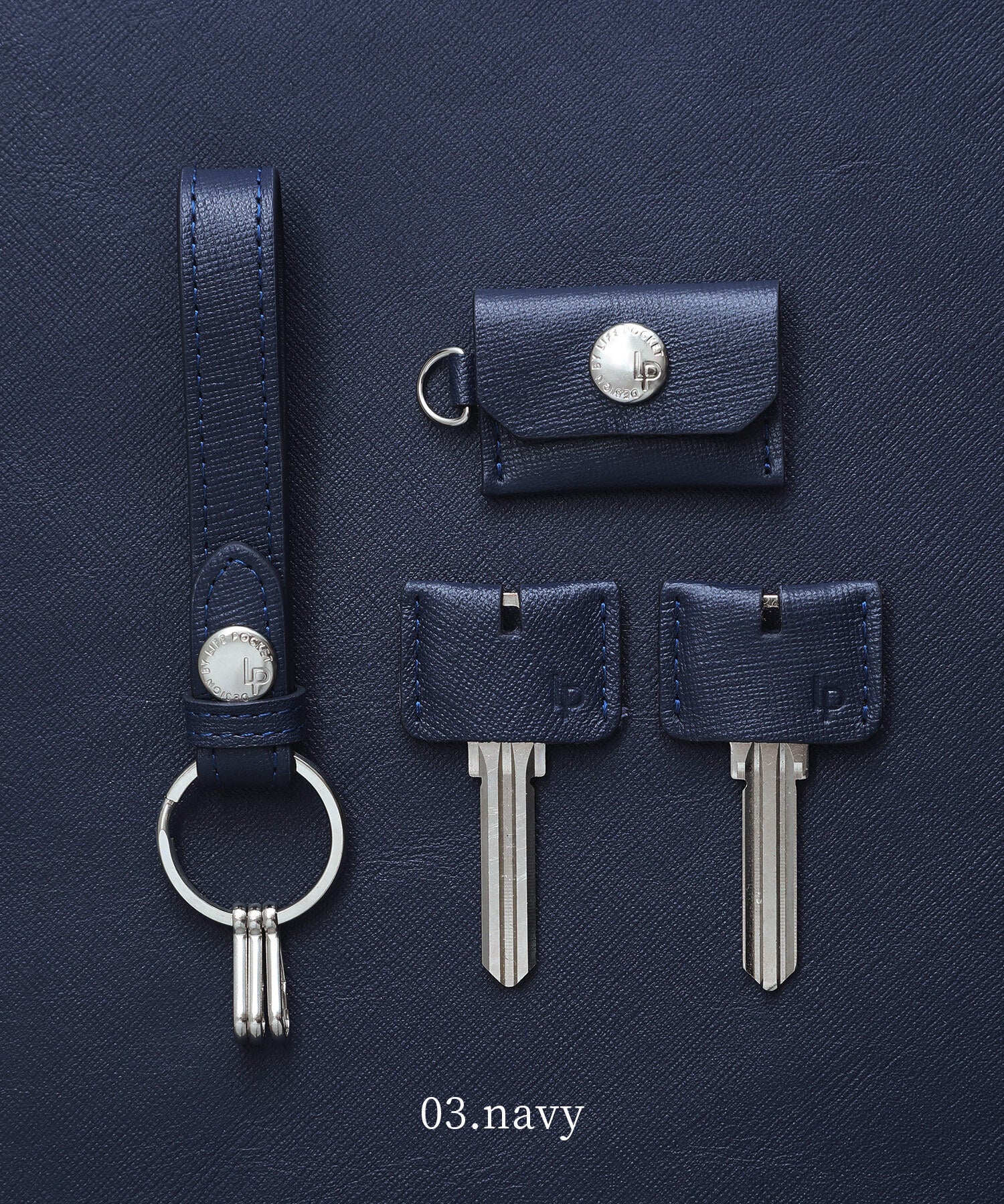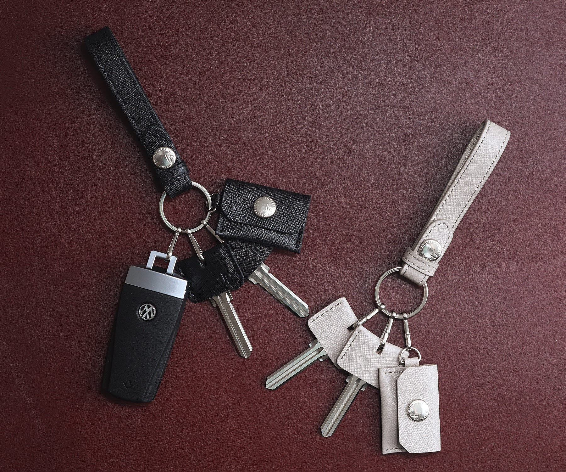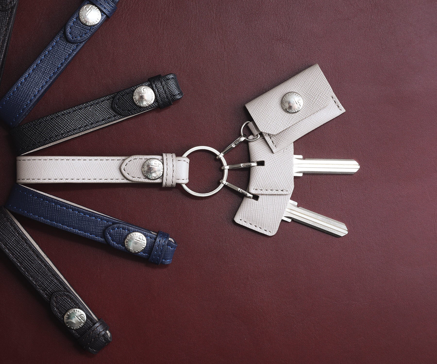 キーリングには、ストラップと同じサフィアーノレザーを使用したレザーキーキャップがセットになっております。