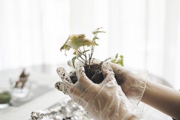 観葉植物のアイビーの根っこを土でくるみ、丸く握ります。