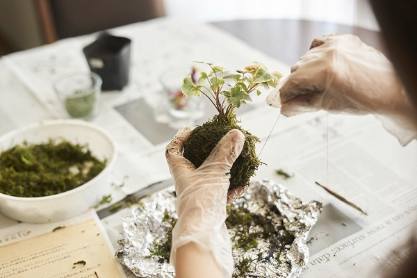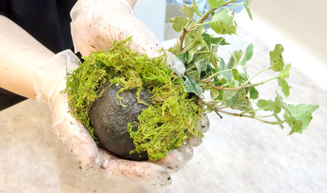 最後にキュッと。まるで着物の帯締めを締めるかのように。こうして「生命花手毬」の苔玉が完成です。