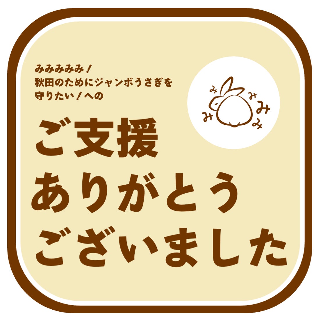 2022/09/02 15:49みみみみみ!秋田のためにジャンボうさぎを守りたい!にご支援くださった皆様へこの度は温かいご支援を誠にありがとうございました。目標金額を達成することはできませんでしたが、こんなにも多くの方がジャンボうさぎのことを知ってくださり、ジャンボうさぎを守るためにご支援くださったことが、とても嬉しく、励みになります。重ねて御礼申し上げます。リターンにつきましては、順次発送してまいりますので今しばらくお待ちください。今後も、「秋田のためにジャンボうさぎを守る」を目標に、精進してまいります! もっと見る
