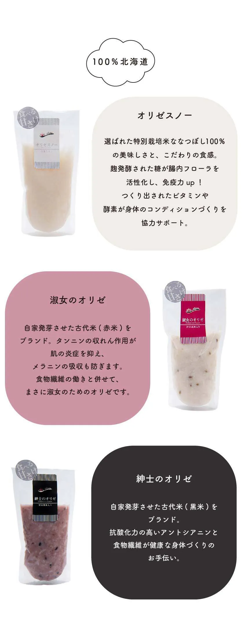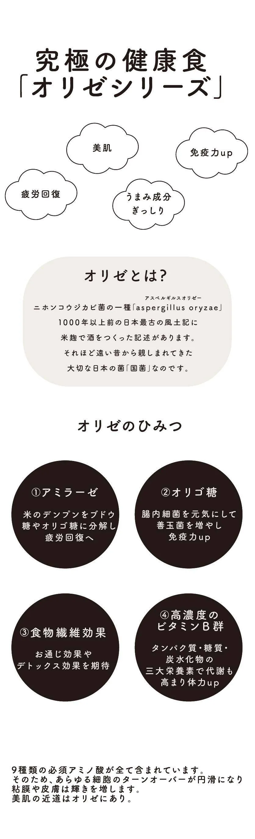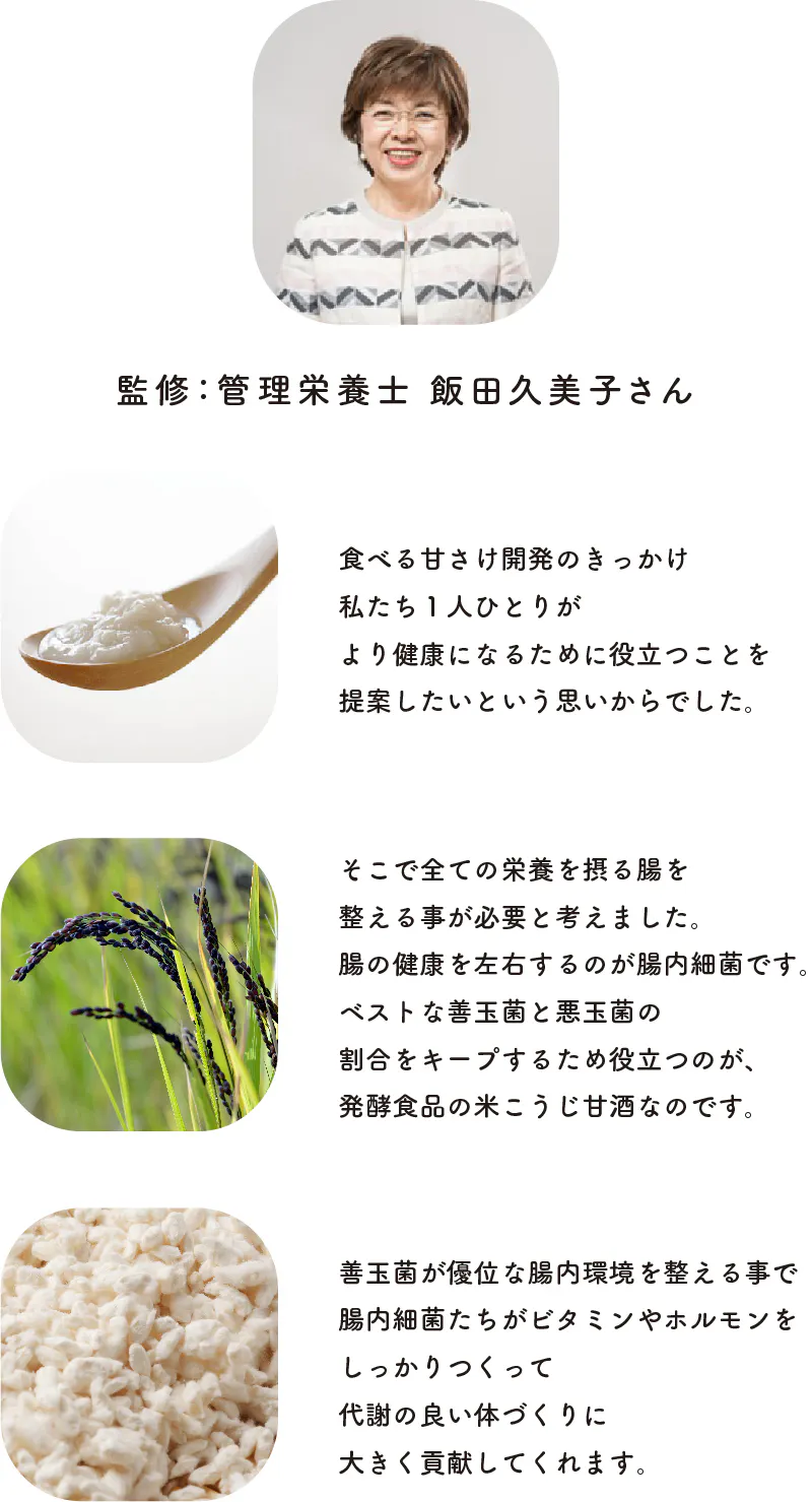 この活動の中で「健康にも配慮した食選び」だけではなく、並行して「腸内環境を整えると、あなたは健康」という視点も必須 と感じ、そのために有効な発酵食品オリゼシリーズを開発しました。