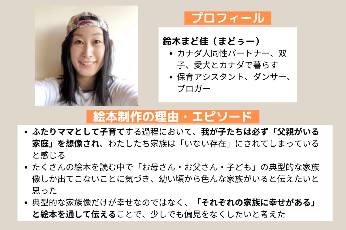 2022/08/09 18:00<まどぅーより>ふたりママとして子育てしていく過程において、我が子たちは周りの方々から「お父さんがいる家庭」を想像されてきました。確かにほとんどの家庭にはお母さんがいて、お父さんがいます。だから、いわゆる典型的な家族像を想像されてしまうのは仕方がないことだな、と諦めてきました。でも、ある日ふと、「仕方がないから」と何もせずにいたら、わたしたち家族は本当にいない存在になってしまうのではないかと思ったんです。多様な家族がいることを子どもたちに伝えたい!!その想いから始まった絵本制作。同じく著者のなるちゃんとジェニーとたくさん悩んで考えた1年半でした。感謝を述べるのはわたしたちなのに、「こんな絵本を作ってくれてありがとう」と言われることが何度もありました。この絵本の可能性を信じて、たくさんの方から応援していただけたこと、嬉しく思っています。みなさまのおかげで、当初 掲げていた目標は数日で達成し、先日セカンドゴールも達成することができました。感謝の気持ちでいっぱいです。本当にありがとうございます。子どもたちのもとへ、にじいろの鳥が羽ばたく日をわたし自身も楽しみにしています!【まどぅープロフィール】世界一周中に出会ったカナダ人同性パートナーと2016年に結婚。2019年に双子を授かり「ふたりママ」として子育て中。学Pダンスコンテストにて「結婚の自由をすべての人に」をテーマにした作品が優勝。LGBTQ+やジェンダーバイアスをブログにて発信。保育園勤務。絵本「かぞくです」著者まどぅーブログhttps://madokasuzuki.comまどぅーTwitterhttps://twitter.com/madocanadaまどぅーInstagramhttps://www.instagram.com/kidsplay_madu/https://www.instagram.com/dancemessengermadoka/<なるジェニより>クラウドファンディングをご支援くださったみなさま、本当にありがとうございます。これだけ多くの方々が、私たちの想いに共感してくれている、、!途切れないご支援と、みなさまの応援コメントを読ませていただきながら、心がポカポカとあたたかい日々でした。「我が子たちに読みます!」「知り合いの保育園に寄贈させていただきます」「保育の現場で子どもたちに読むのが待ち遠しいです!」こんなコメントも多く寄せられていて、私たちだけの力では届けられない子どもたちのところまでみなさまのおかげで届いていくんだな、、とリアルに想像できました。夢が現実になっていく感覚がたいへん嬉しかったです。ほかにも、「こんな絵本を待っていました!」「多様性の絵本を作ってくれてありがとうございます!」などの声も。みなさまから、この絵本を読むであろう子どもたちへの愛を深く感じました。この絵本が生み出せるのは、小さな意識の変化だけかもしれない。それでも、その小さな変化の積み重ねが「多様性を当たり前にそこにあるものと受けとめる」社会を作っていけると信じています。絵本「かぞくです」がみなさまの元へ届く日を楽しみにお待ちください!【なるジェニのプロフィール】YouTubeチャンネル"Girls Right TV"運営。パートナーシップ宣誓後、結婚式をLIVE配信。同性婚の実現に向けて少しでも発信したいふたり。絵本「かぞくです」著者。YouTube”Girls Right TV”https://www.youtube.com/channel/UCrohdlpBR_EGEfjEXKhyzlgなるジェニTwitterhttps://twitter.com/narumi_jennyなるジェニInstagramhttps://www.instagram.com/narumi_jenny/ もっと見る