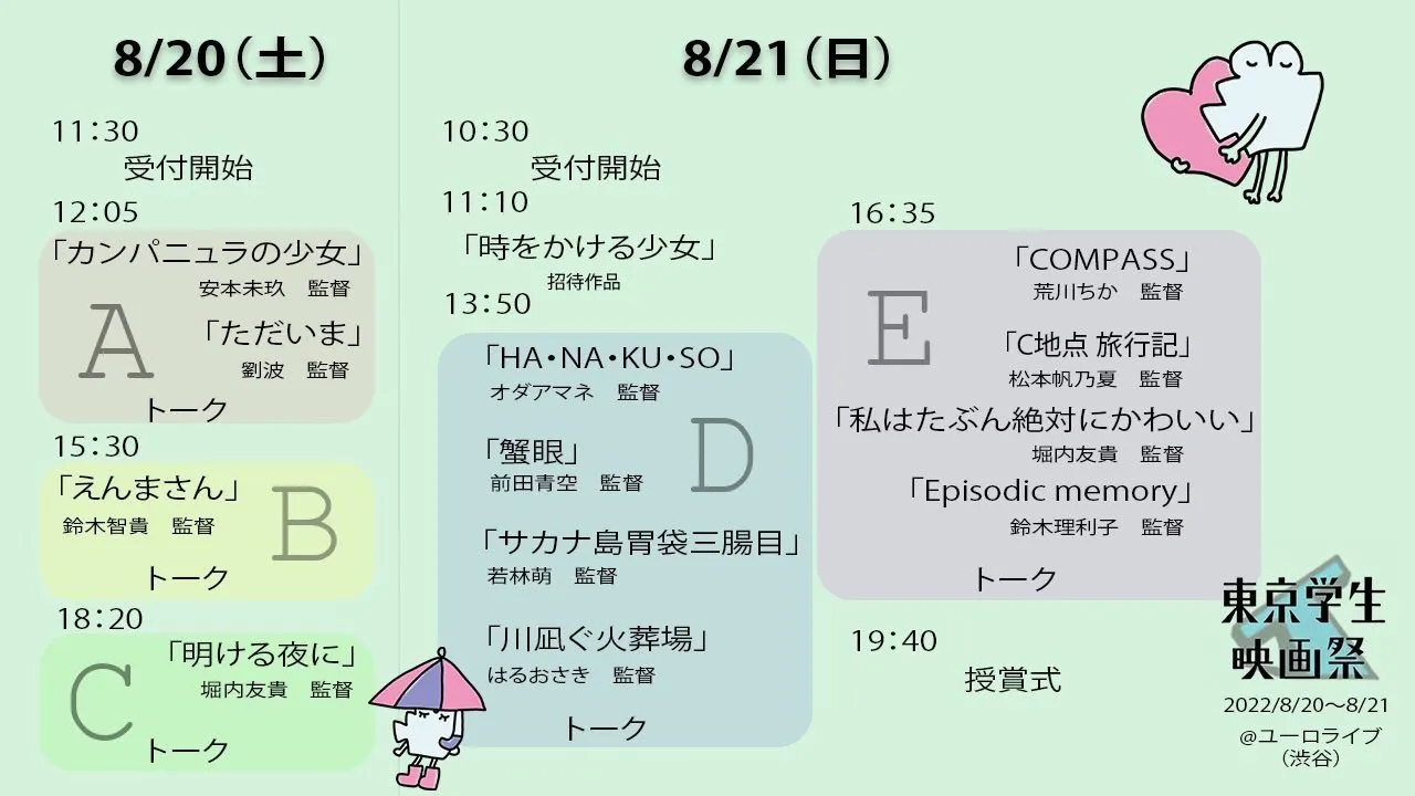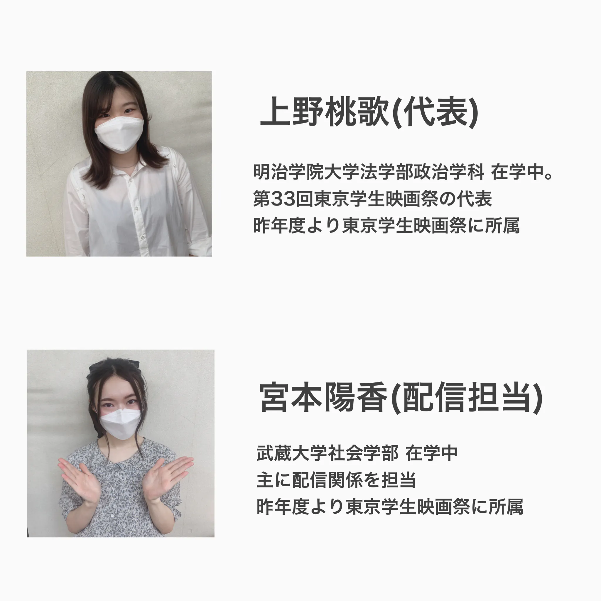 今年度(第33回)の東京学生映画祭コンペティションでは全作品の中から、実写長編4作品・実写短編4作品・アニメーション4作品の計12作品と招待上映作品1作品を上映いたします。