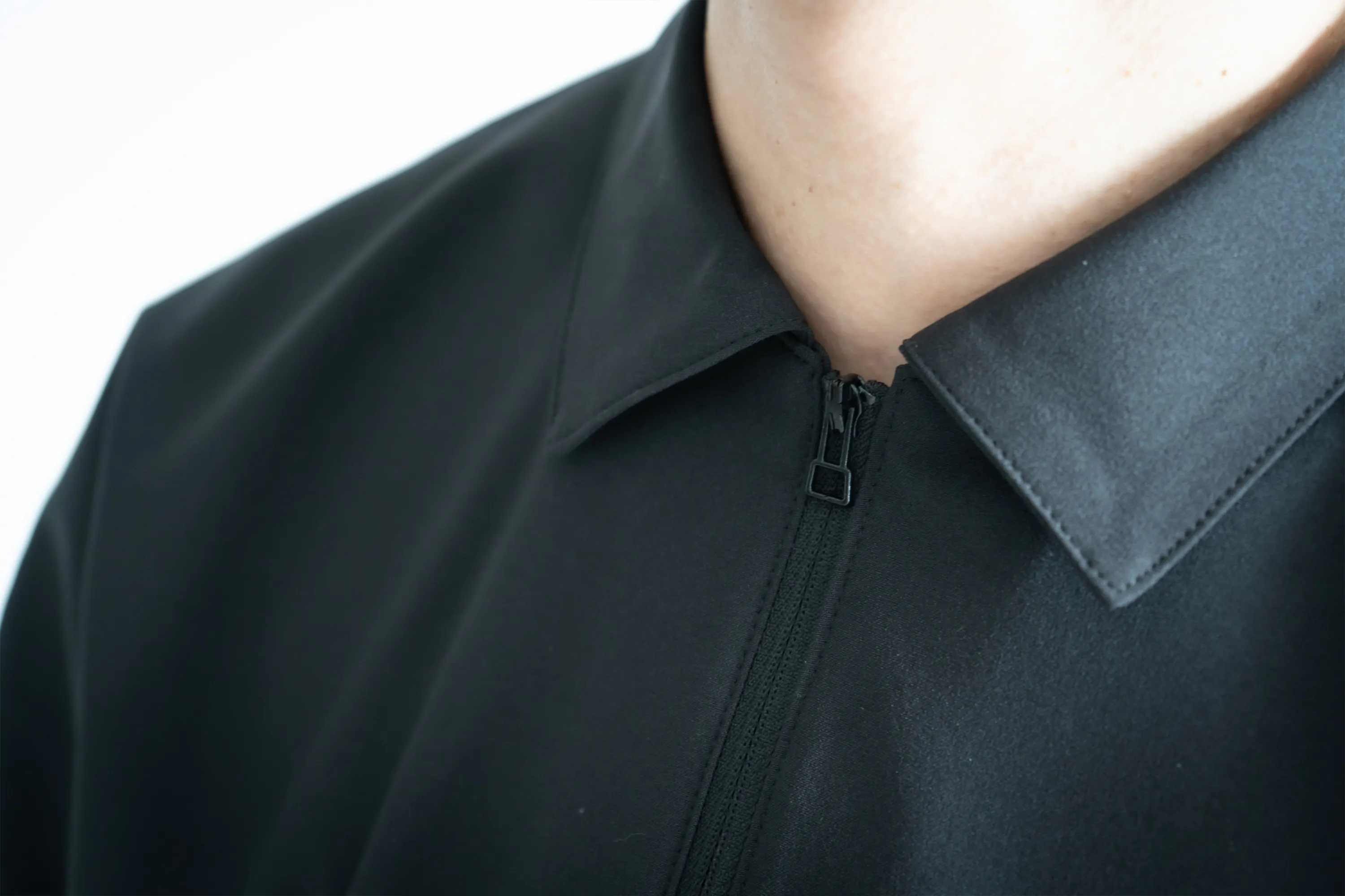 通常ポロシャツと言えばボタンの仕様ですが、今回はジップアップの仕様にしています。またコイルファスナーを裏使いすることで、よりソリッドな印象になるように仕上げています。暑い日などはジップを少し開いてラフに着こなして頂くことも可能です。