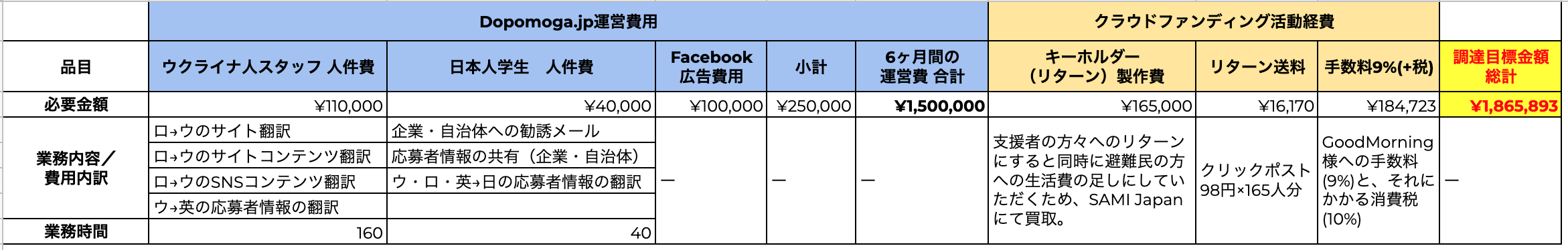 2024/05/21 10:00皆様、ご無沙汰しております!2022年9月-2023年12月の15ヶ月間の活動報告をさせていただきます。Dopomoga.jpの皆様からいただいた支援金を活用した活動実績を報告させていただきます。以前ご報告させていただきましたとおり、目標の150%で達成できました。ありがとうございました。当初の計画としては、半年間の人件費を支援いただくことを目標に進めていましたが、2023年にかけてウクライナ周辺国の情勢の変化に伴ってFacebookのアド配信にかける金額を減らしていったため、結果的に15カ月間の人件費を支払うことができました。皆様、本当にありがとうございました。重ねて感謝申し上げます。【収支報告】2023年12月時点・クラウドファンディングで頂いた金額:2,554,335円・キーホルダー代:-165,000円(2022年11月)・広告費:-216,644円(2022年9月-2023年9月の1年間)・人件費:-150,000円×15ヶ月(2022年9月-2023年12月)=-77,309円(赤字)【その他の活動実績】2023年1月-12月また、上記の収支に関わる活動以外で、Dopomoga.jp(SAMI)として厚生労働省の避難民向けウクライナ語YouTubeショート動画の制作(+ウクライナ語への翻訳)を担当させていただきました。また、ウクライナ人スタッフ(カーチャ)の日本移住についてもSAMIから拠出する形でサポートしました。⚫︎2023年3月・12月厚生労働省の避難民向けウクライナ語YouTubeショート動画(合計6本)の制作をサポートしました。⚫︎2023年3月-2023年11月Dopomoga.jpのウクライナ人スタッフが日本に移住するにあたり、人件費以外の生活に関わる費用(賃貸契約費、渡航費、生活用品購入)をサポートしました。2024年もDopomoga.jpの活動を続けてまいりますので、引き続き、どうぞよろしくお願いいたします。SAMI / Dopomoga.jp 平井 もっと見る