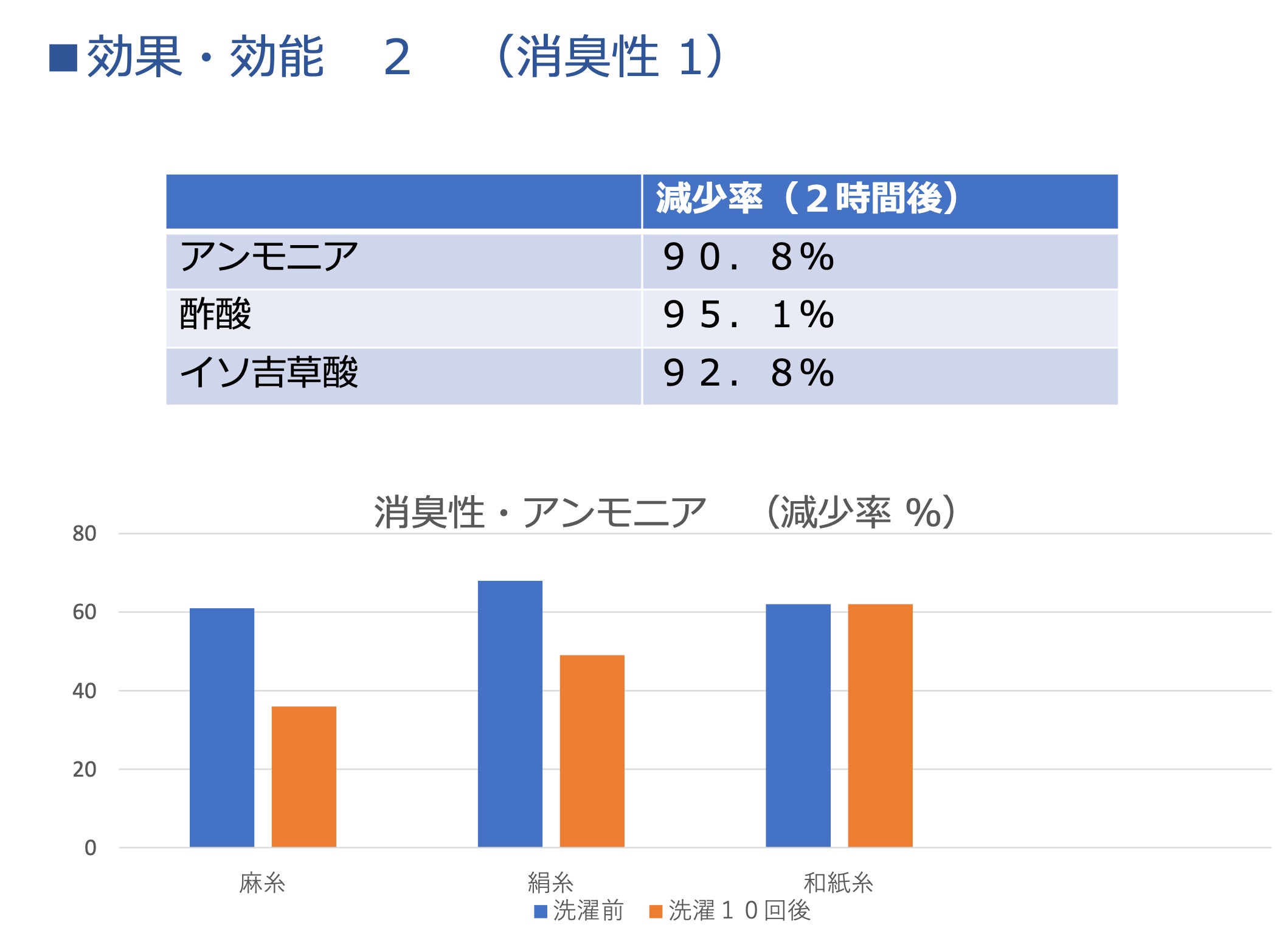 ニオイの元となるアンモニアや酢酸を2時間で90%以上もの減少を促す効果があります。