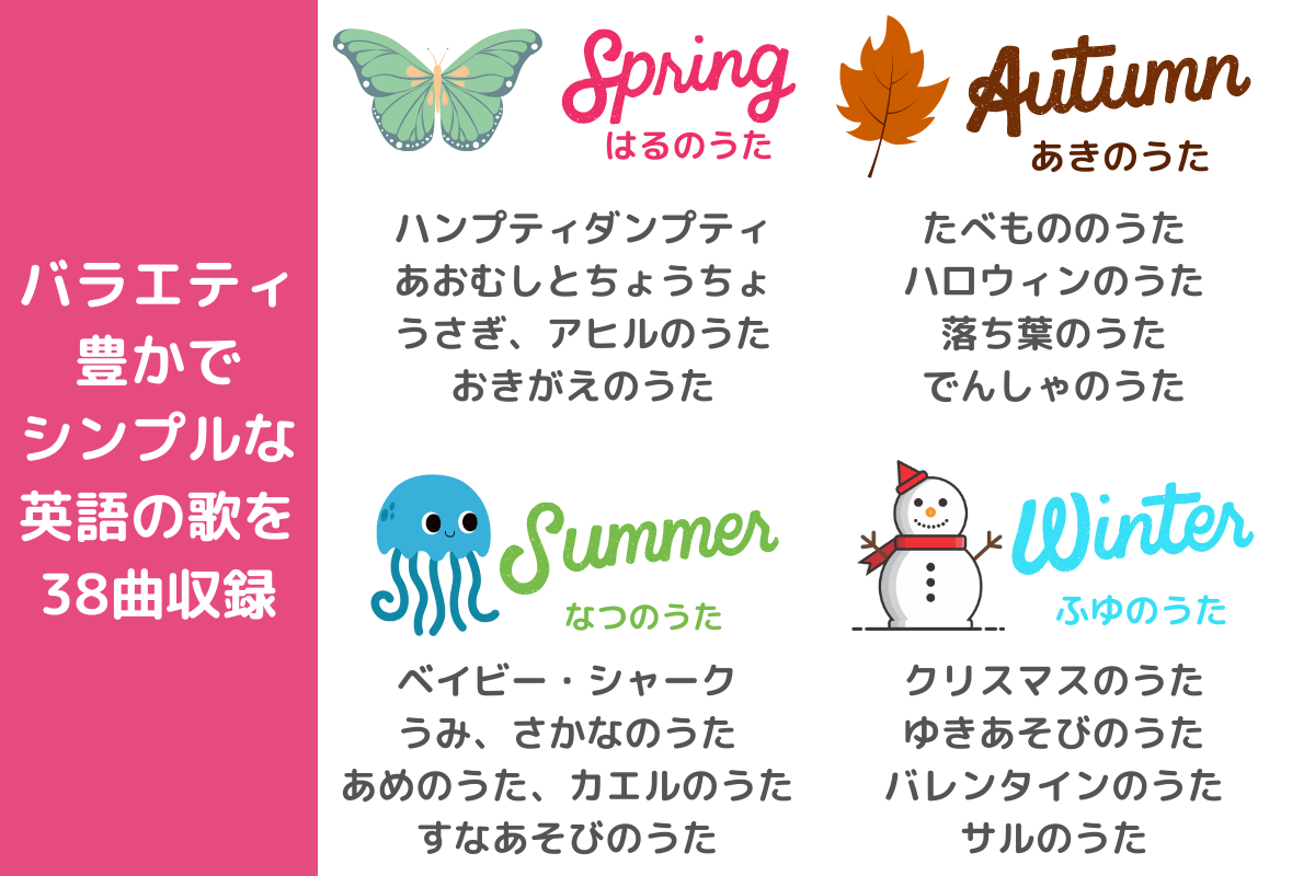 Seasonal Songsには、Rhymoeのレッスンで歌っている季節の歌を38曲収録しました。