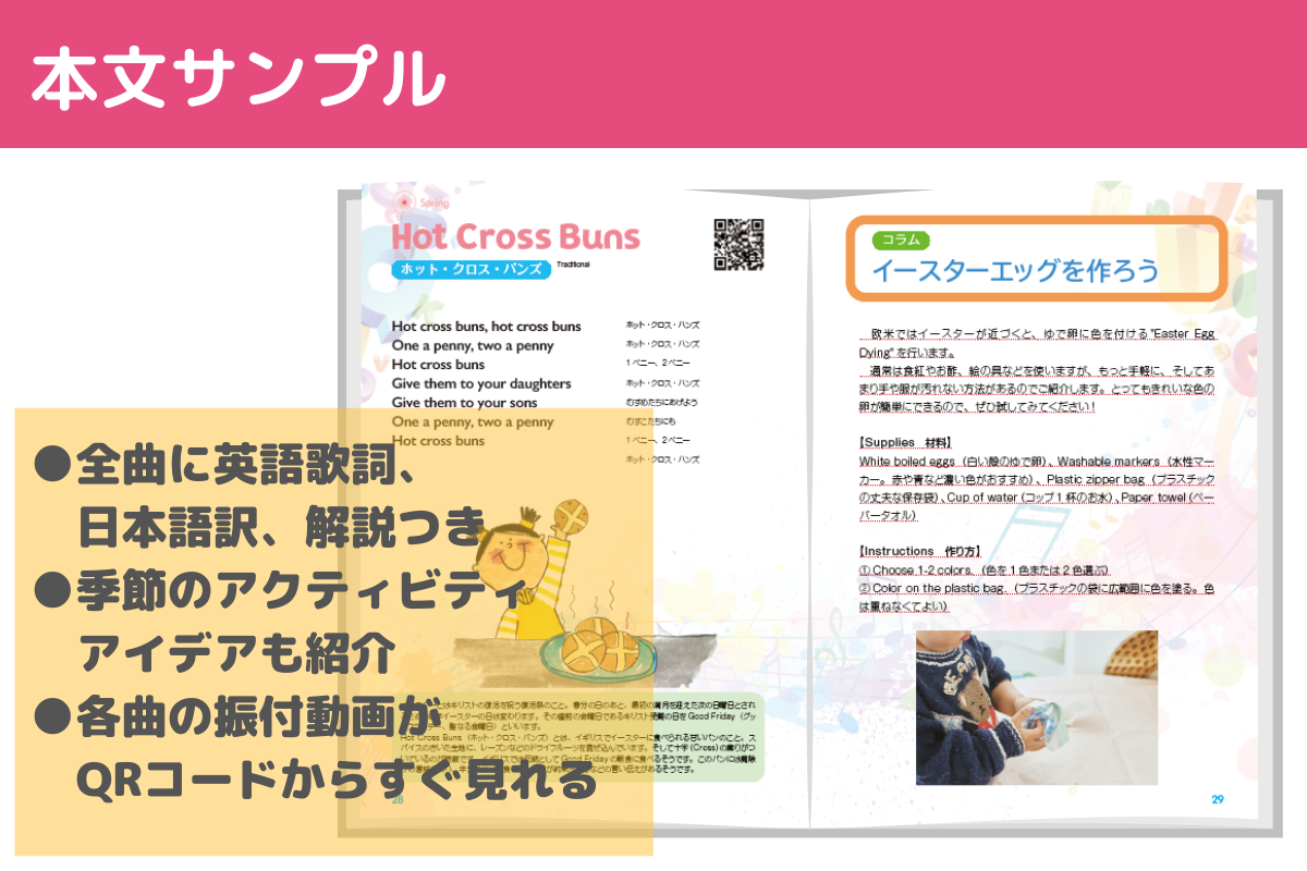 ●すべての曲の英語の歌詞、日本語訳、解説、振付ビデオのQRコード、そしてかわいい手描きのイラストを掲載