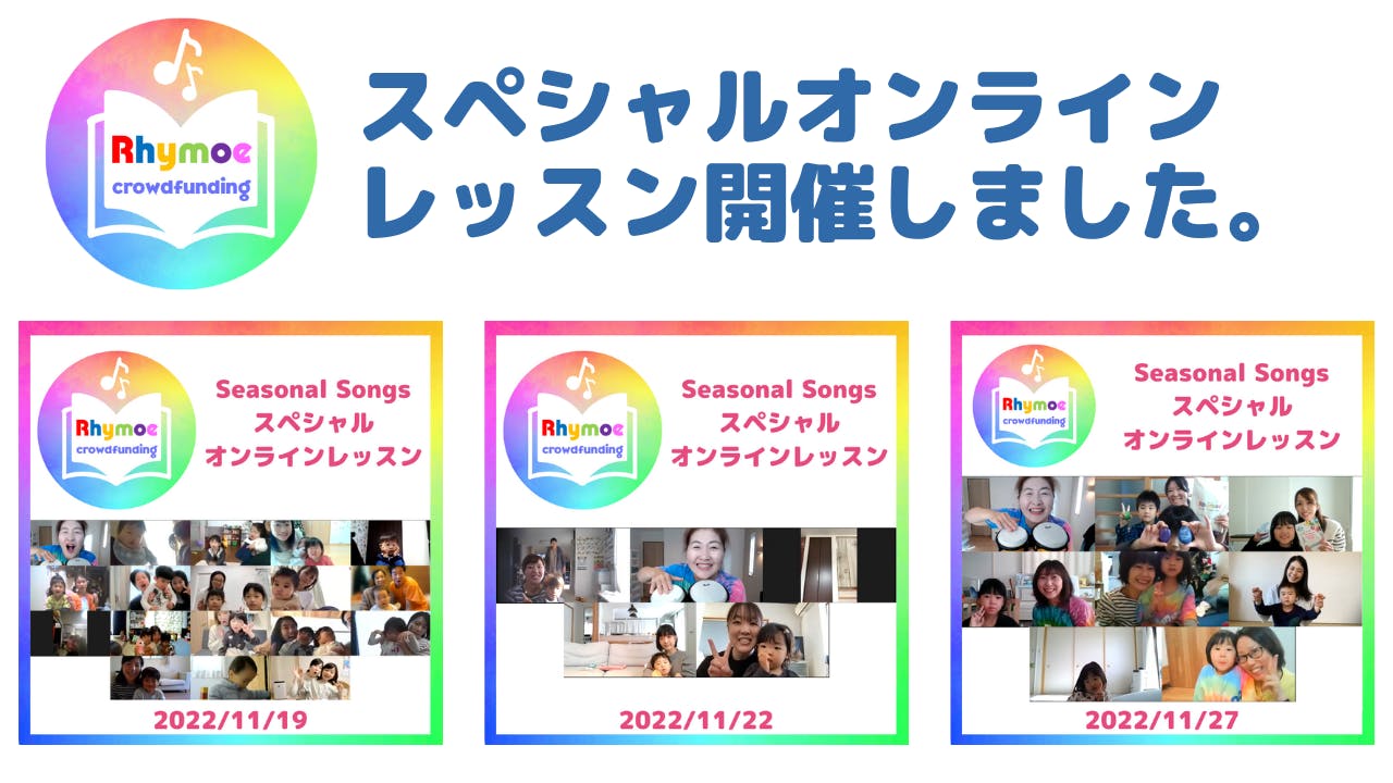 2022/11/29 08:00リターンの一つである「Rhymoeスペシャルオンラインレッスン」を3回に分けて開催しました!今回は出版した「Rhymoe Seasonal Songs えいごのうたがたのしいきせつのうた」に収録した曲をたくさん使った、60分盛りだくさんの内容となりました!おてんきの歌を歌ったり、でんしゃごっこをしたり、アヒルさんやサメに会ったり…かと思えば、ポップコーンを食べたり、雪遊びをしたり…季節を感じられる、シンプルで、思わずいっしょに口ずさんだり、手遊びをしたくなる歌をたくさん体験しただけたと思います。1作目のFavorite Songsと同様、ソングブックの各曲のページには、英語の歌詞、日本語訳、曲の解説、かわいい手描きのイラストが掲載されています。それだけでなく、それぞれの歌をどのように楽しめばいいかがわかるデモ動画が見れるQRコードも掲載しています!あるお子さんは、自分でソングブックを開き、好きな曲のページのQRコードをママのスマホで読み取っては踊り、また別の曲のページのQRコードを読み取って踊る…という楽しみ方をしてくださっているそうです!Seasonalソングブックの巻末には、全38曲すべてのデモ動画が一度に見れるプレイリストのQRコードもありますので、お使いくださいね。【 オンラインレッスンにご参加いただいた方からの嬉しいご感想】「よしみ先生のパワフルさを1時間感じっぱなしでした。子どももずっと楽しくリズムに乗っていました。親もどういう風に関われば良いのか分かったのでまたやってみたいと思います。ありがとうございました! 」「よしみ先生のライモーはいつ?と子どももずっと先生のレッスンを楽しみにしていました!seasonal songsの本の内容をたくさん使ったレッスンで、どれも楽しかったです。親子一緒にたくさん歌い、おどり、笑い、とったも楽しかったです。 」「今日のオンラインレッスン、とても楽しかったです!いっぱい歌って踊って、そして笑って、あっという間の1時間でした。特に電車ごっこが、親子3人で走り回ってかなり盛り上がりました!お陰様で汗だくになりました(笑) 3歳の息子は途中居なくなったりもしましたが、気になる曲があると戻ってきて真剣に聞いていました。 5歳の娘は、終始ノリノリで初めて聞く曲でも一生懸命真似していました。終わった途端「もう一回!」というので「もう終わりだよ〜」というと「じゃあ明日も!」と言うので困りました(笑) 」「レッスンとても楽しかったです。Rhymoeのおかげで、英語好きな子になりました。ソングブックをたくさんきいて、歌えるようにしたいと思います。これからも応援しています! 」「本日はありがとうございました。オンラインでこどもの集中が続くのかが心配でしたが、思っていた以上に楽しんでいた事が嬉しかったです。終わった後も鼻歌で歌っている様子を見ると微笑ましかったです。 主人も英語でのリズムの大切さを実感しており、歌って踊るレッスンには感激していました。普段の遊びの中でも活用させてもらいたいです。 」「いつもは小2のお姉ちゃんも一緒なのですが今回は4歳の次女と2人で全力で楽しませていただきました。レッスンが静と動の絶妙なコンビネーションのため、全力で歌って踊って、座って集中することが4歳ながらできていて嬉しく思っていました。いつもお姉ちゃんと2人だったので我慢していたのか?!4歳児が思いっきりママに甘えており、熱い幸せな時間を共有できました〜 心から楽しかったです」「今回は人数も少なかったこともあり、名前をたくさん呼んでもらえてうれしかったみたいです。1日中ライモーの曲を誰かが口ずさんている、そんな時間を過ごさせていただきました。 新しいお気に入りの曲もできたようなので、またたくさんソングブックを聴いて楽しみたいと思います。 」「本当に楽しかったです!オンラインでもこんなに親子で楽しんで参加できるのはライモーならではだと思います。子どもが小さい時にライモーに出会えて本当にラッキーだし、ハッピーです!」「『今日楽しかった?』 と聞くと、『たのしかった』 『あしたらいもーなの?』 と答え、息子が楽しんだ様子が伺え嬉しかったです。また、終わった直後に”pat”と言っていたので、warm-upの動画を見せると、レッスン中はやらなかった動作も真似することができました。やってみたい!につながるレッスンをありがとうございました!」「子供たちが起きられなかったり、寝ぼけていたりの我が家でしたが、ライブで参加できたことがとても良かったです。英語のリズムを体感できる楽しさが溢れている授業で、初めてのライモーを楽しませていただきました。音楽を聴くと体が動くくらい、ライモーのソングブックに親しむことができると良いです。よしみ先生のレッスンがとても楽しかったので、ぜひまたレッスンに参加できる機会があると良いと思いました。楽しいソングブックを作成してくださって、ありがとうございます。 」「息子は、今日は画面外にい