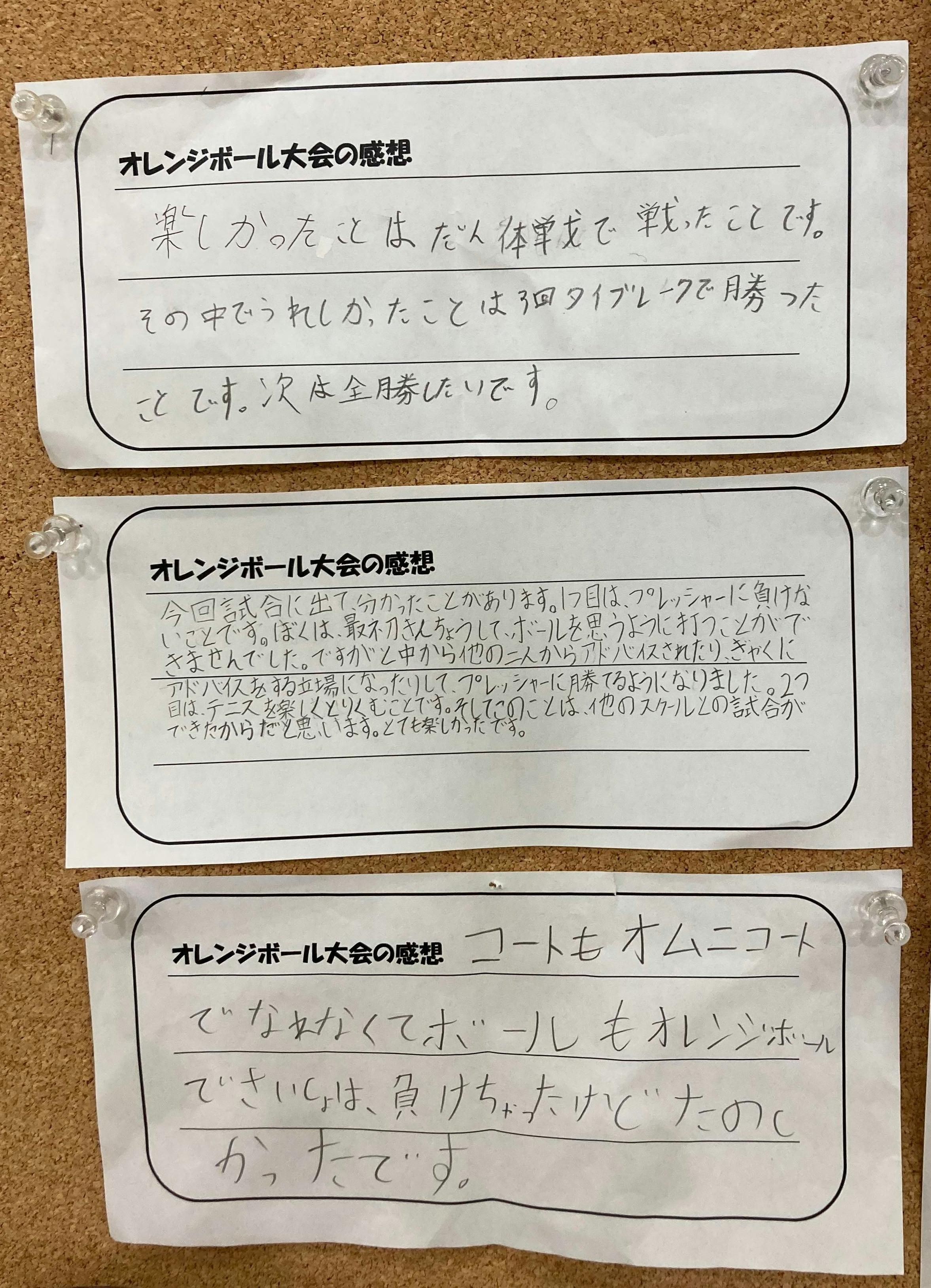 オレンジボールでの試合を通じてチームワーク・自主性を学び成長して欲しいです。将来的には育った選手がアメリカのヒルトンヘッドのワールドテニスアカデミーに遠征し試合をしてもらいたいです。テニスだけではなく国際的な感覚をそして世界を感じてくれたらいいかなと思います。とにかく最初の一歩を踏み出し一緒に成長しよう!その一歩を踏み出せば世界が変わります!