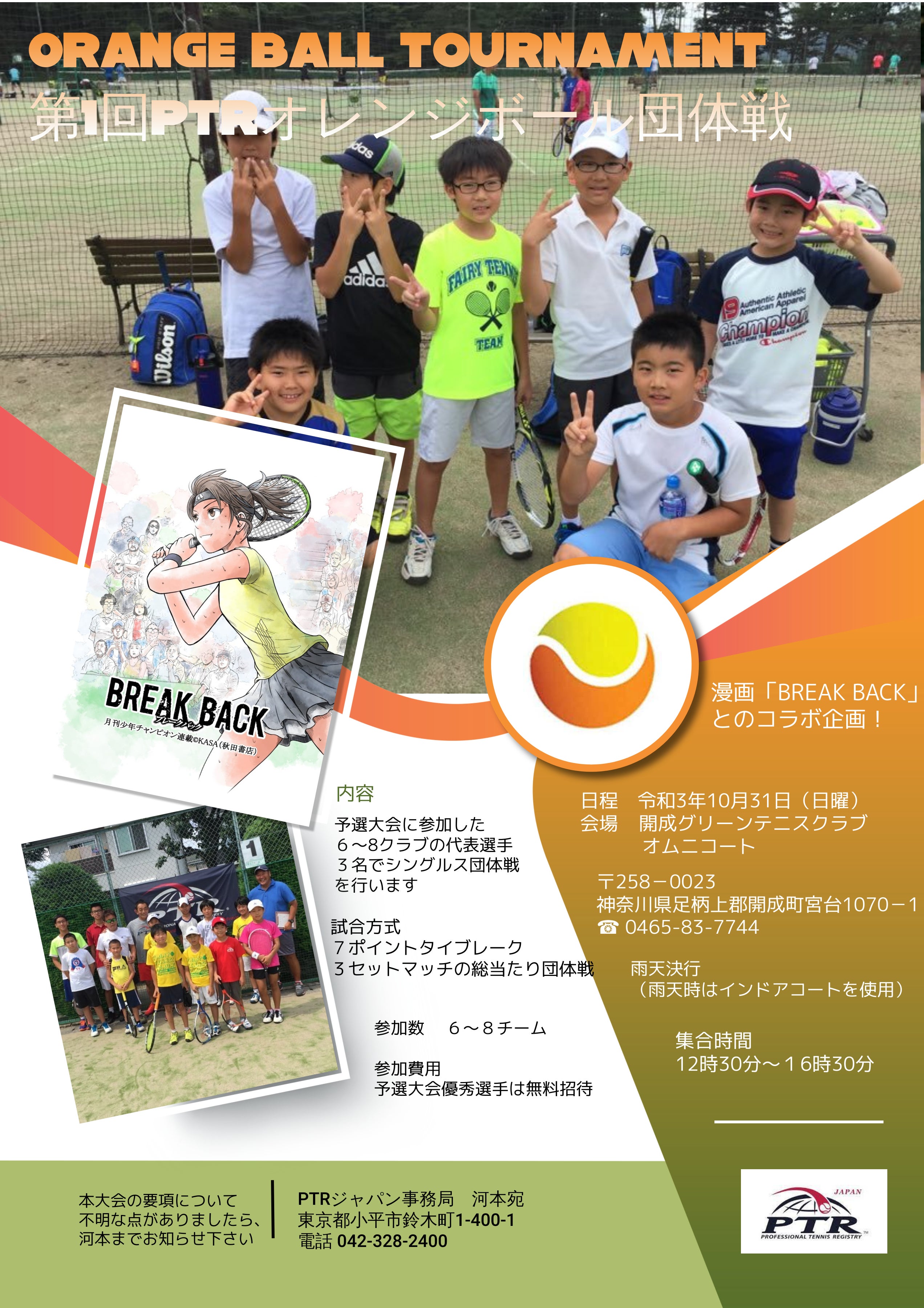 昨年、自分達の思いを形にしようと思い、小規模ですがオレンジボール大会を団体戦で開催しました。東京、埼玉、神奈川のクラブから4チーム、12人の子供たちが参加してくれました。テニス漫画で人気の「Break Back」とコラボ企画で、著者のKASAさんにも応援して頂きました!