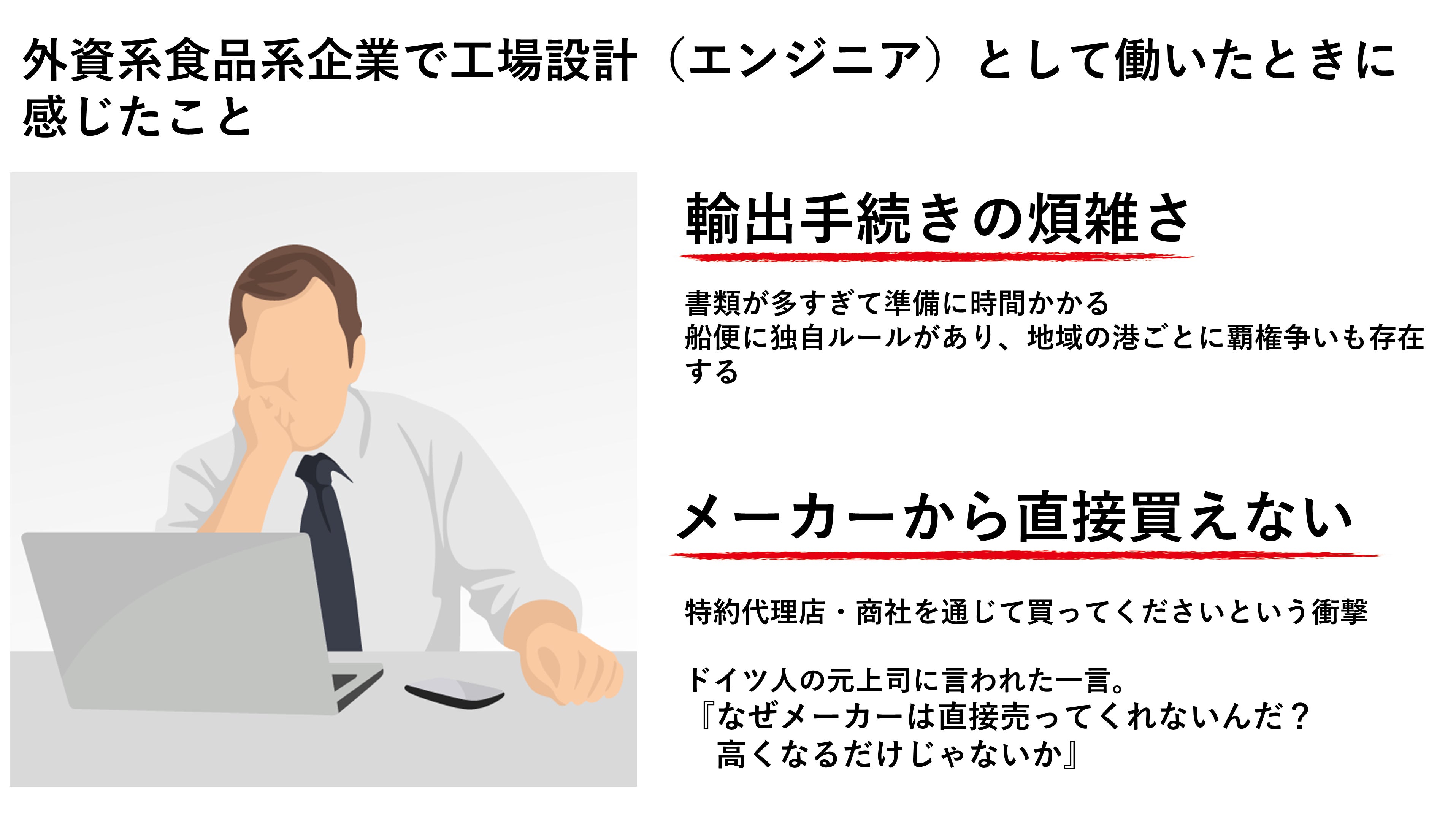 某大手外資系企業に5年間勤務し、プロジェクトエンジニアとして工場の設備導入に携わる。