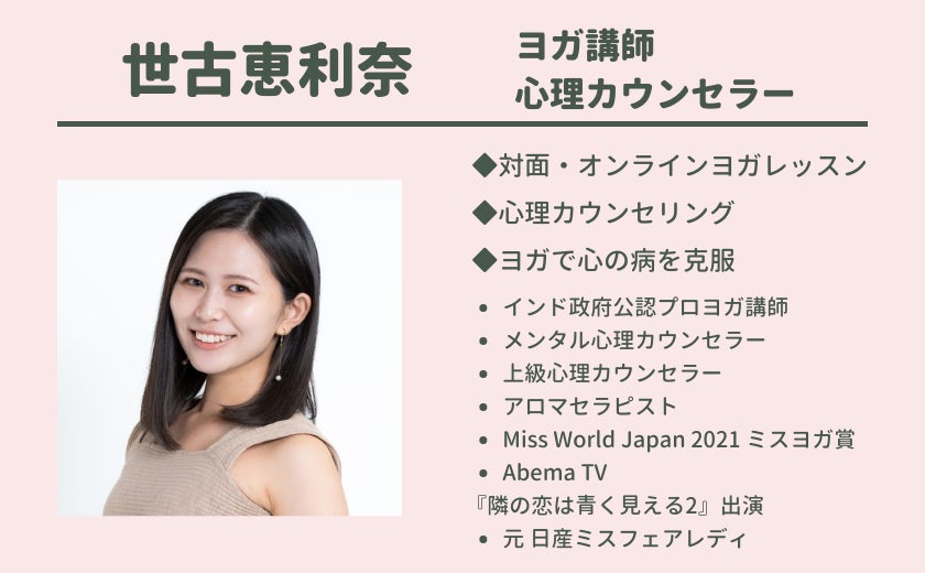 はじめまして、ヨガ講師&心理カウンセラーの世古恵利奈です。