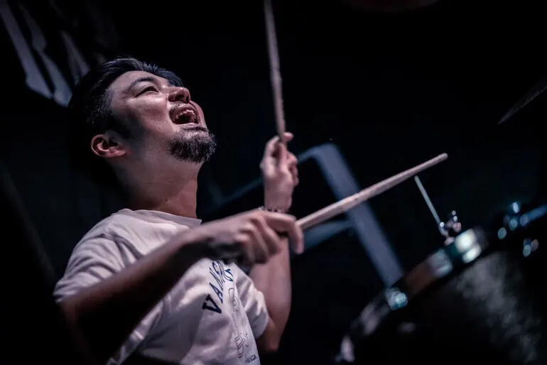 Dr Shogoのテクニックに裏打ちされた確かなドラムプレイがフロント2名のパフォーマンスを可能にしている。