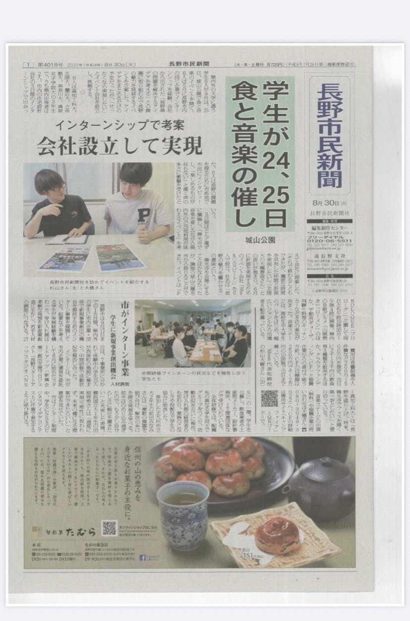 長野市にある会社のインターンシップで出会った大学3年生6人による会社です。私たちは、来年善光寺でフェスを行う第一歩として、今年の9月24日、25日に長野市の城山公園で食と音楽を利用したイベントを開催します。イベントの名前は「PROLOGUE」といいます。はじまりという意味を込めてこの名前を付けました!日本の中心は長野!「PROLOGUE」をきっかけに、長野の魅力を私たちが発信していきます!!