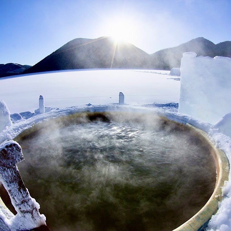 標高810m、極寒の地、然別湖は真冬は-30度を超える日もあるほどです。この寒さがあるので湖は最大で1mもの氷の覆われます。その凍った湖の真ん中に源泉かけ流しの露天風呂が出来るのです。雪原にポツンとお風呂が出現します。