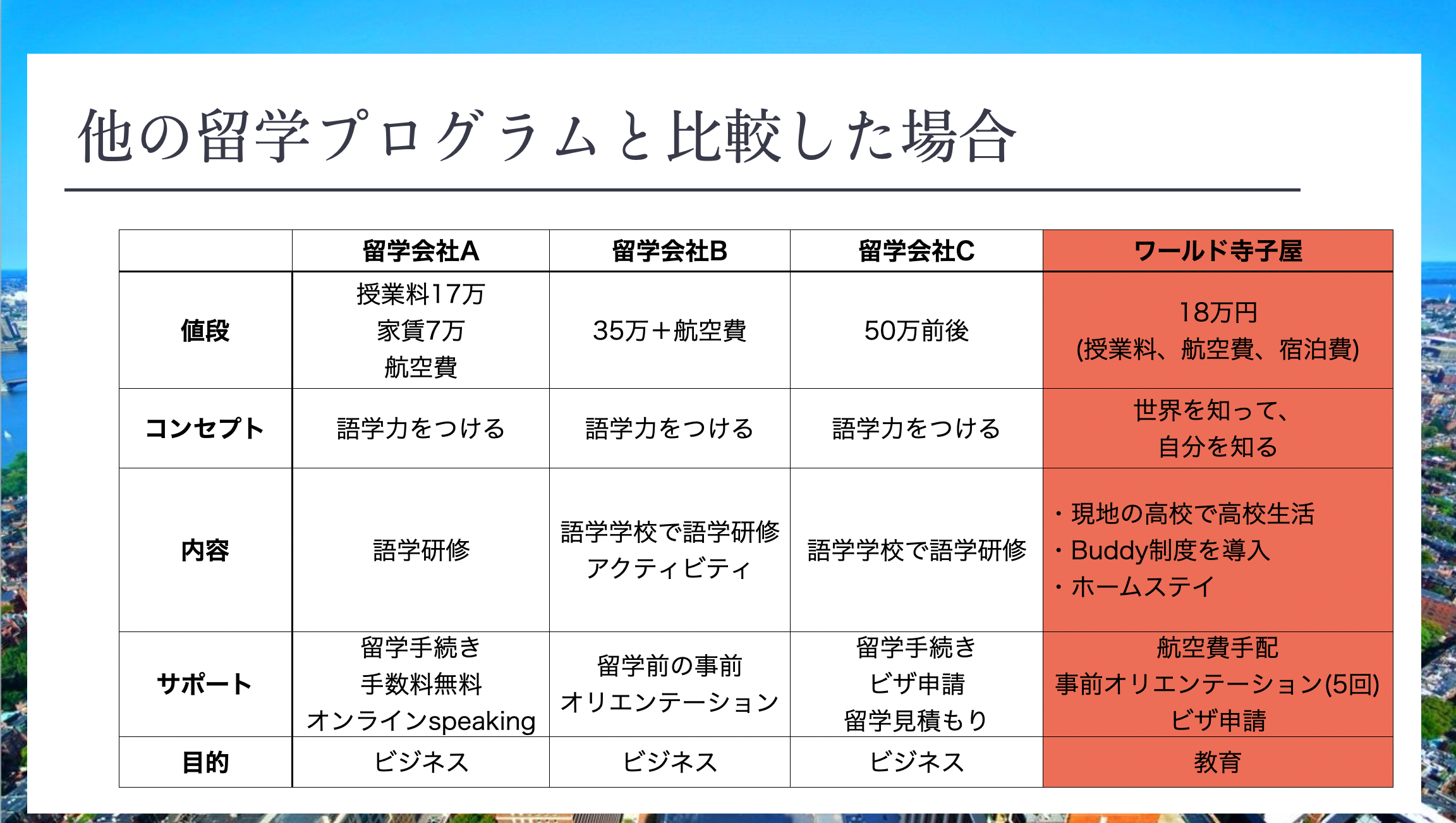 22万円は一般の留学プログラムと比べてかなり安い値段設定ですが、教育費用に22万円をどの家庭がすぐに出せる価格ではないです。ですので、プログラム全体の費用も22万円から更に18万円に下げることで、より多くの人が参加できるプログラムにできたらと考えています。
