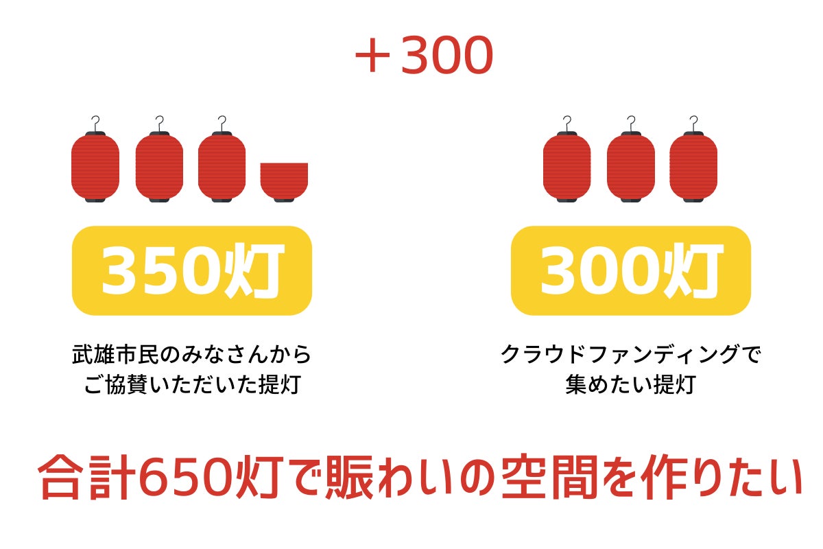 ご協賛金で、提灯 300 灯増やし、現在ある 350 灯と合わせ、合計 650 灯の提灯で、武雄のまちをさらに明るく照らし、にぎわいの創出と 「新しい観光資源」として定着させたいと考えています。