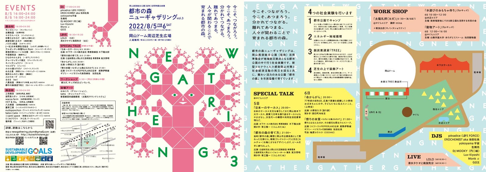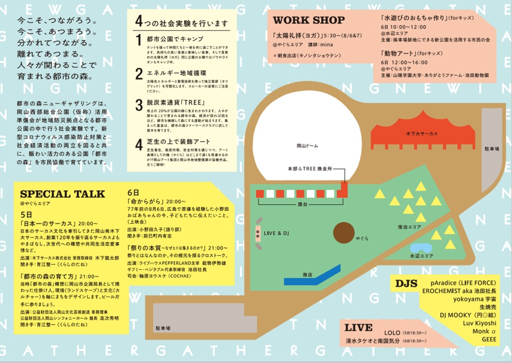 「都市の森ニューギャザリング」は岡山西部総合公園でアーティストさん、飲食店さんなど様々な人を呼んで夜通しみんなで楽しんだり、キャンプできたりと大規模な祭りとなっています。