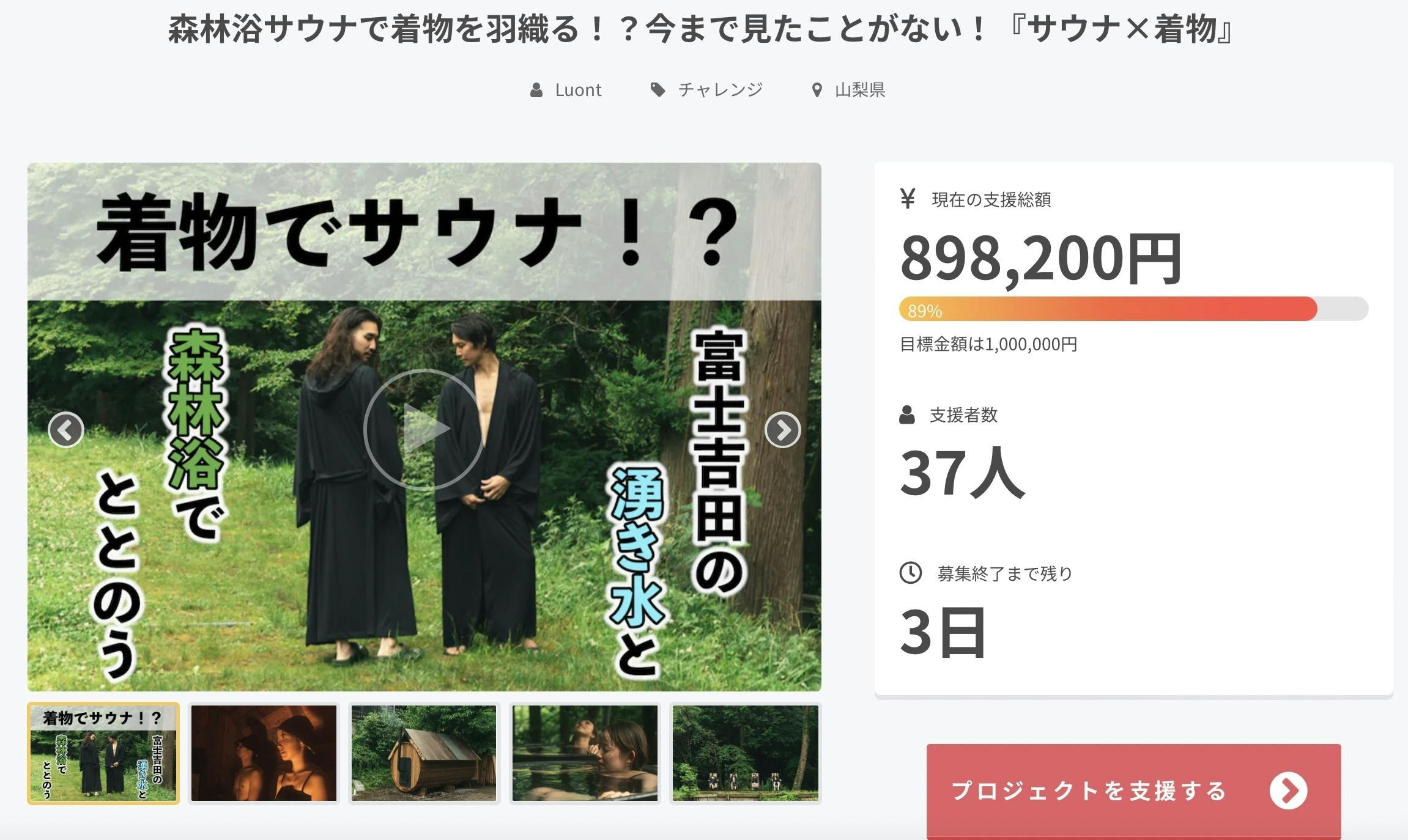 2022/08/28 13:25『サウナ×着物』Luont SAUNA FUJIのプロジェクトが残り3日となりました!!たくさんのご支援、拡散をありがとうございます!おかげさまであと11%で目標達成となりました!あと1歩…!皆様の拡散のご協力、何卒よろしくお願いします!!!https://camp-fire.jp/projects/view/607928 もっと見る