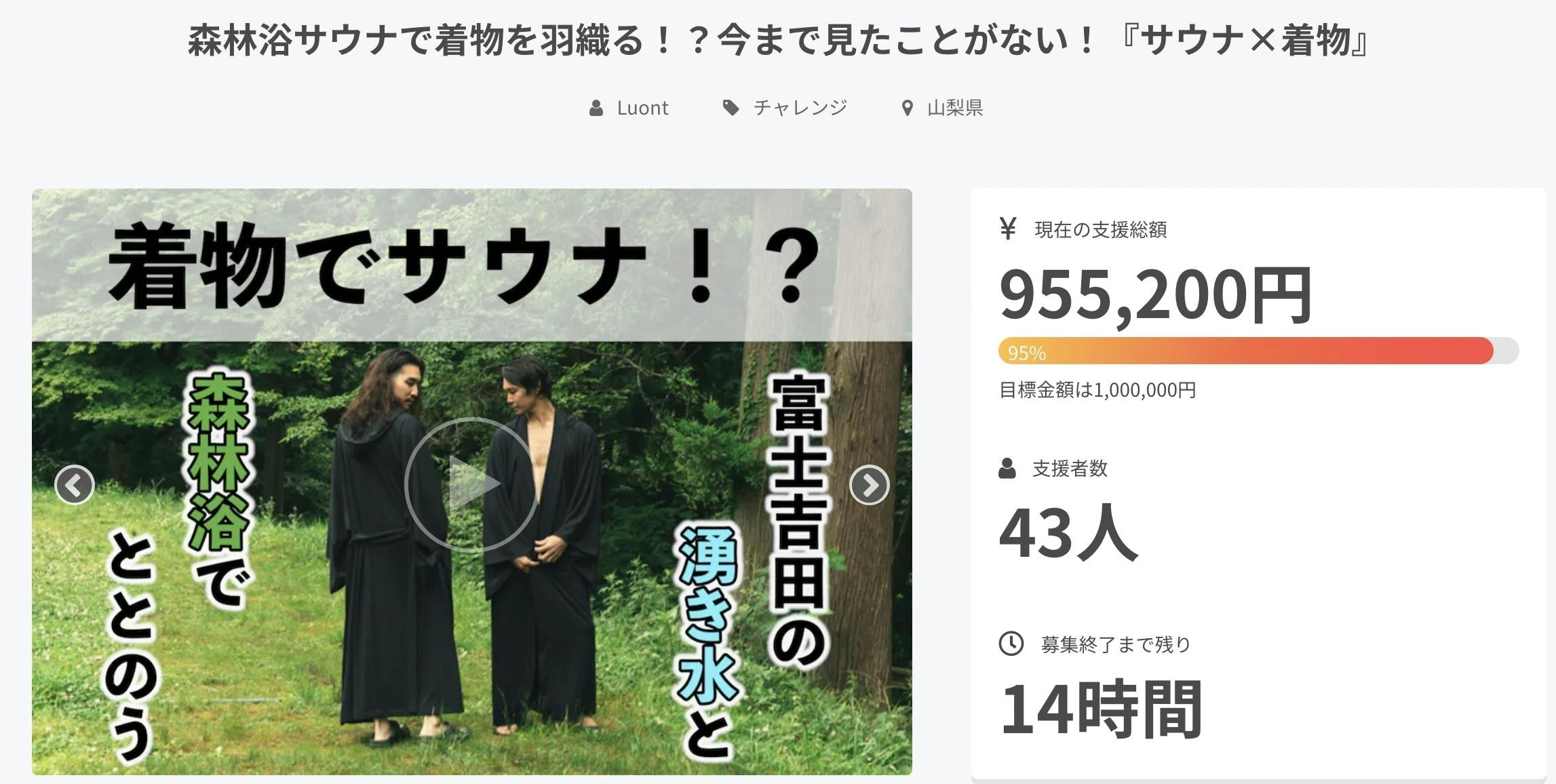 2022/09/01 20:36皆様の温かいご支援のおかげで、クラウドファンディングの目標金額を達成することができました!!本当にありがとうございます!サウナで着物ってありえなくない!?と思われた方も多いかもしれませんがサウナは元々日本古来の入浴方法で、昔は着物を着てサウナに入ってました。つまり、『着物×サウナ』は新しいものではなく、原点に戻ったのです。ゆったりとした着物ガウンは、極上のととのいを手助けしてくれます。是非一度Luont SAUNA FUJIを体験してみてください。きっと人生の『癒し』となってくれます。改めまして、この度はLuont SAUNA FUJIをご支援頂き、誠にありがとうございました!今後ともLuont SAUNA FUJIをよろしくお願い致します。 もっと見る