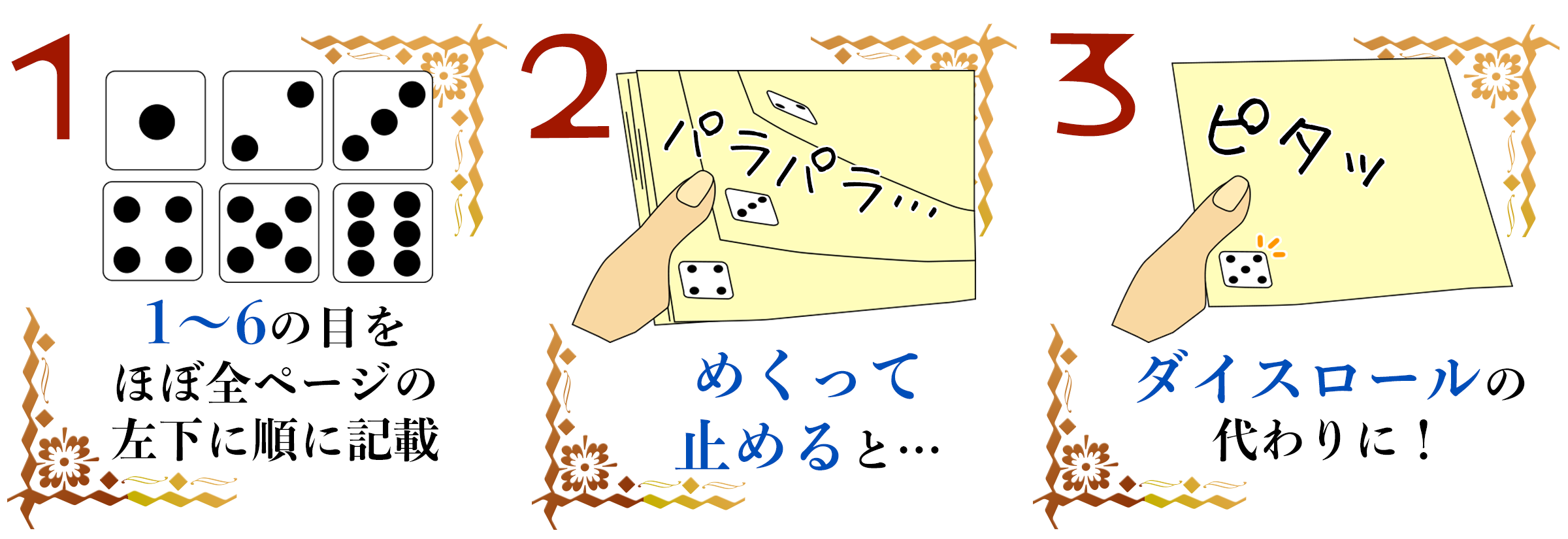 左ページの左下にはそれぞれ1~6のサイコロ(ダイス)が描かれています。ページをパラパラとめくって止めることで、ダイスがない時にはダイスロールとしても使えます。
